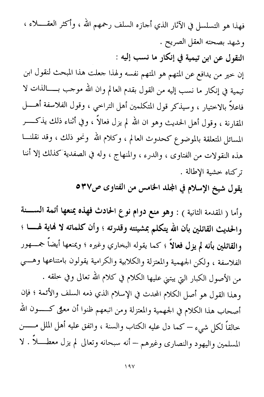 إن خير من يدافع عن المتهم هو المتهم نفسه ولهذا جعلت هذا المبحث لنقول ابن تيمية في إنكار ما نسب إليه من القول بقدم العالم وان الله موجب بالذات لا فاعلاً بالاختيار، وسيذكر قول المتكلمين أهل التراخي، وقول الفلاسفة أهل المقارنة، وقول أهل الحديث وهو ان الله لم يزل فعالاً، وفي أثناء ذلك يذكر المسائل المتعلقة بالموضوع كحدوث العالم، وكلام الله ونحو ذلك، وقد نقلنا هذه النقولات من الفتاوى، والدرء، والمنهاج، وله في الصفدية كذلك إلا أننا تركناه خشية الإطالة.