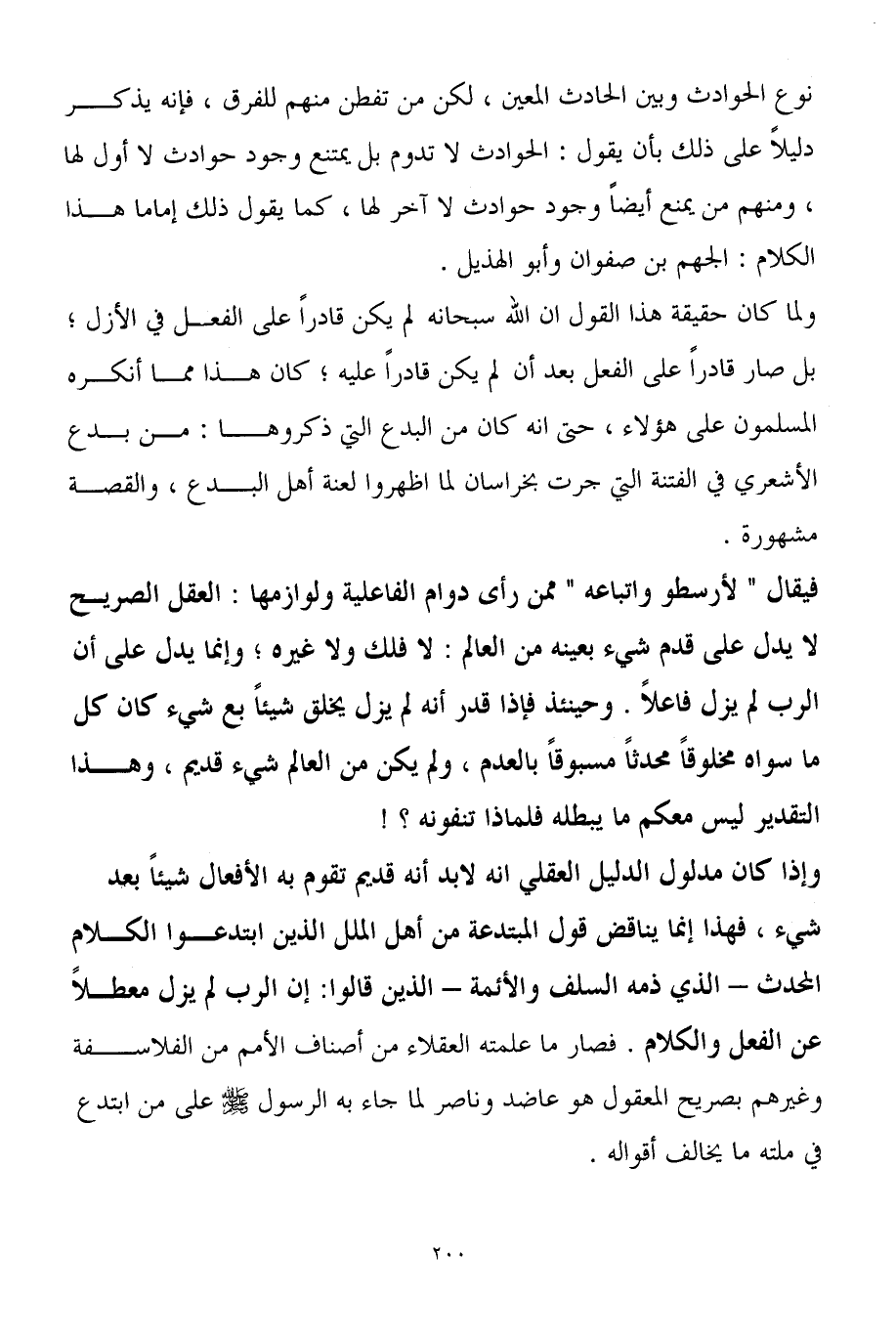 فيقال " لأرسطو واتباعه " ممن رأى دوام الفاعلية ولوازمها: العقل الصريح لا يدل على قدم شيء بعينه من العالم: لا فلك ولا غيره؛ وإنما يدل على أن الرب لم يزل فاعلاً. وحينئذ فإذا قدر أنه لم يزل يخلق شيئاً بع شيء كان كل ما سواه مخلوقاً محدثاً مسبوقاً بالعدم، ولم يكن من العالم شيء قديم، وهذا التقدير ليس معكم ما يبطله فلماذا تنفونه؟ !