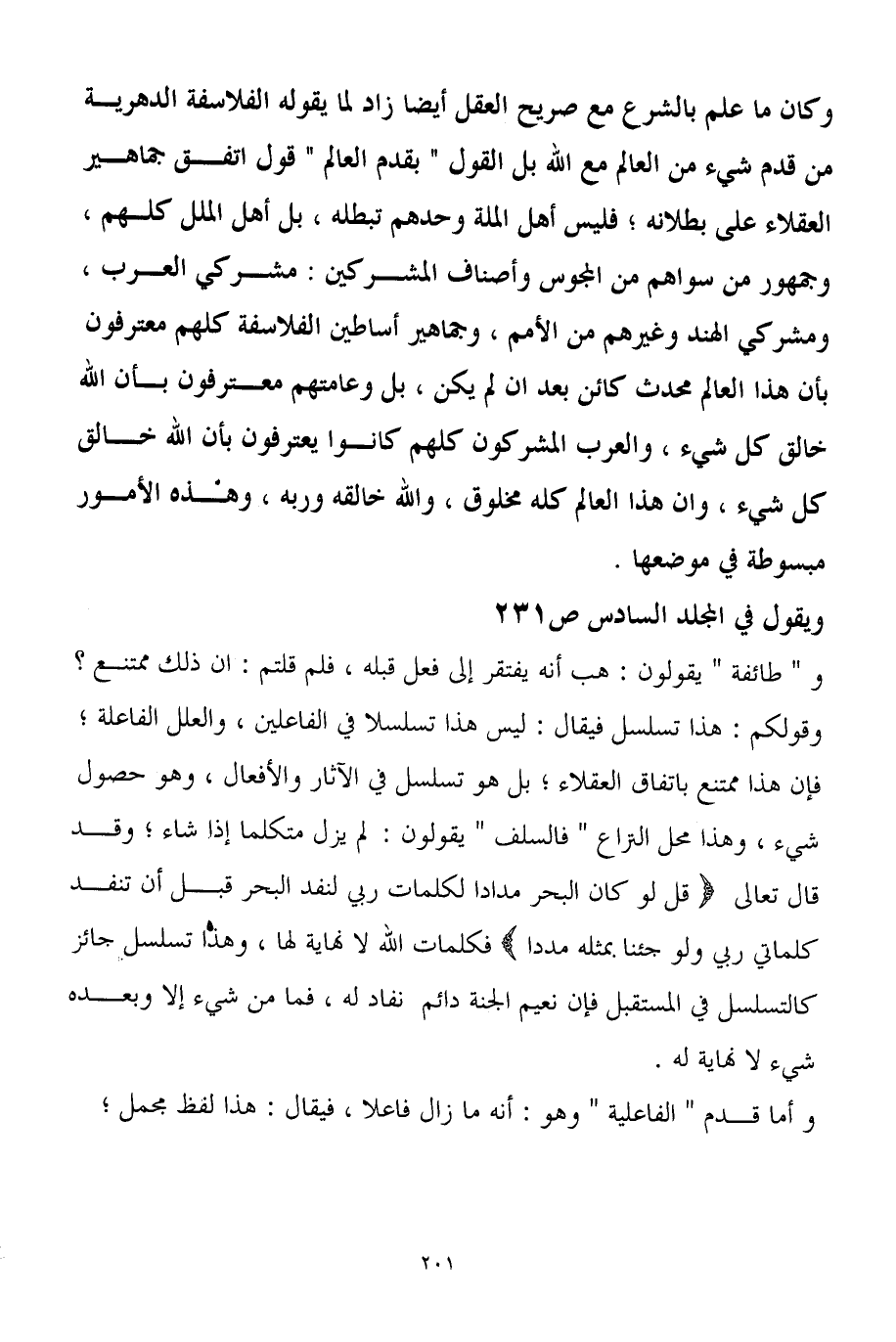 و" طائفة " يقولون: هب أنه يفتقر إلى فعل قبله، فلم قلتم: ان ذلك ممتنع؟ وقولكم: هذا تسلسل فيقال: ليس هذا تسلسلاً في الفاعلين، والعلل الفاعلة؛ فإن هذا ممتنع باتفاق العقلاء؛ بل هو تسلسل في الآثار والأفعال، وهو حصول شيء، وهذا محل النزاع " فالسلف " يقولون: لم يزل متكلماً إذا شاء؛ وقد قال تعالى {قل لو كان البحر مداداً لكلمات ربي لنفد البحر قبل أن تنفد كلماتي ربي ولو جئنا بمثله مددا} فكلمات الله لا نهاية لها، وهذا تسلسل جائز كالتسلسل في المستقبل فإن نعيم الجنة دائم نفاد له، فما من شيء إلا وبعده شيء لا نهاية له.