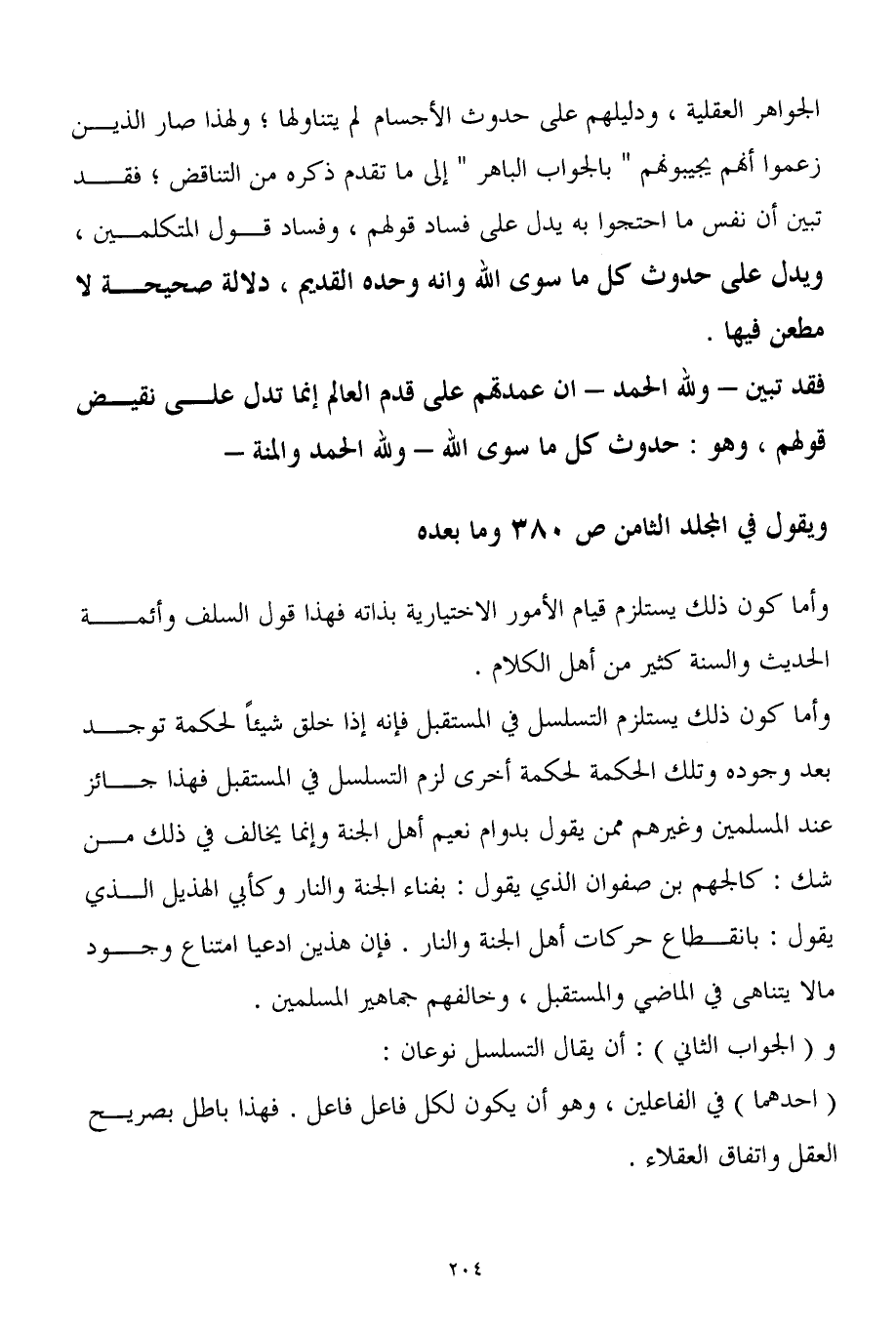 وأما كون ذلك يستلزم التسلسل في المستقبل فإنه إذا خلق شيئاً لحكمة توجد بعد وجوده وتلك الحكمة لحكمة أخرى لزم التسلسل في المستقبل فهذا جائز عند المسلمين وغيرهم ممن يقول بدوام نعيم أهل الجنة وإنما يخالف في ذلك من شك: كالجهم بن صفوان الذي يقول: بفناء الجنة والنار وكأبي الهذيل الذي يقول: بانقطاع حركات أهل الجنة والنار. فإن هذين ادعيا امتناع وجود مالا يتناهى في الماضي والمستقبل، وخالفهم جماهير المسلمين.