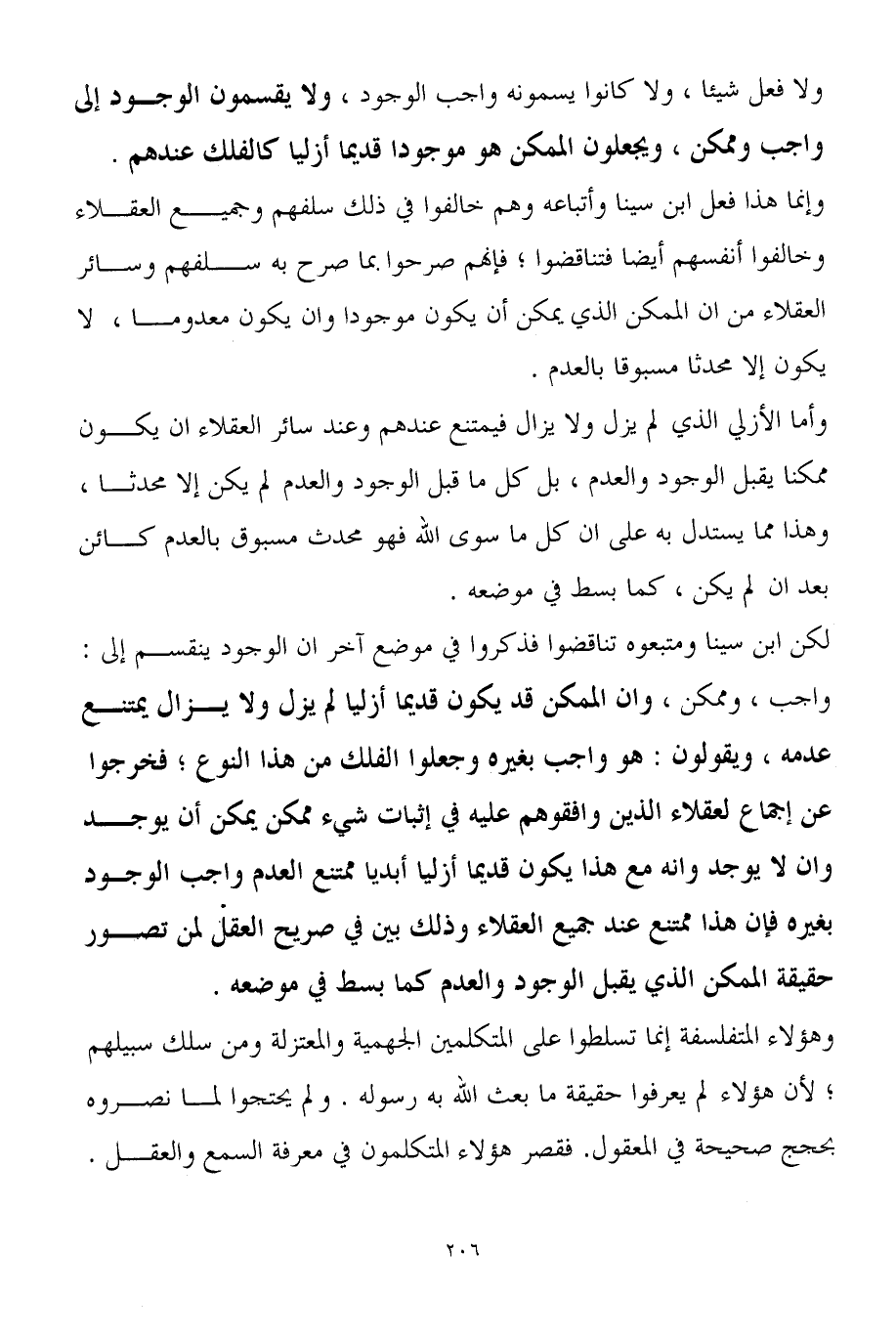 لكن ابن سينا ومتبعوه تناقضوا فذكروا في موضع آخر ان الوجود ينقسم إلى: واجب، وممكن، وان الممكن قد يكون قديماً أزلياً لم يزل ولا يزال يمتنع عدمه، ويقولون: هو واجب بغيره وجعلوا الفلك من هذا النوع؛ فخرجوا عن إجماع لعقلاء الذين وافقوهم عليه في إثبات شيء ممكن يمكن أن يوجد وان لا يوجد وانه مع هذا يكون قديماً أزليا أبدياً ممتنع العدم واجب الوجود بغيره فإن هذا ممتنع عند جميع العقلاء وذلك بين في صريح العقل لمن تصور حقيقة الممكن الذي يقبل الوجود والعدم كما بسط في موضعه.