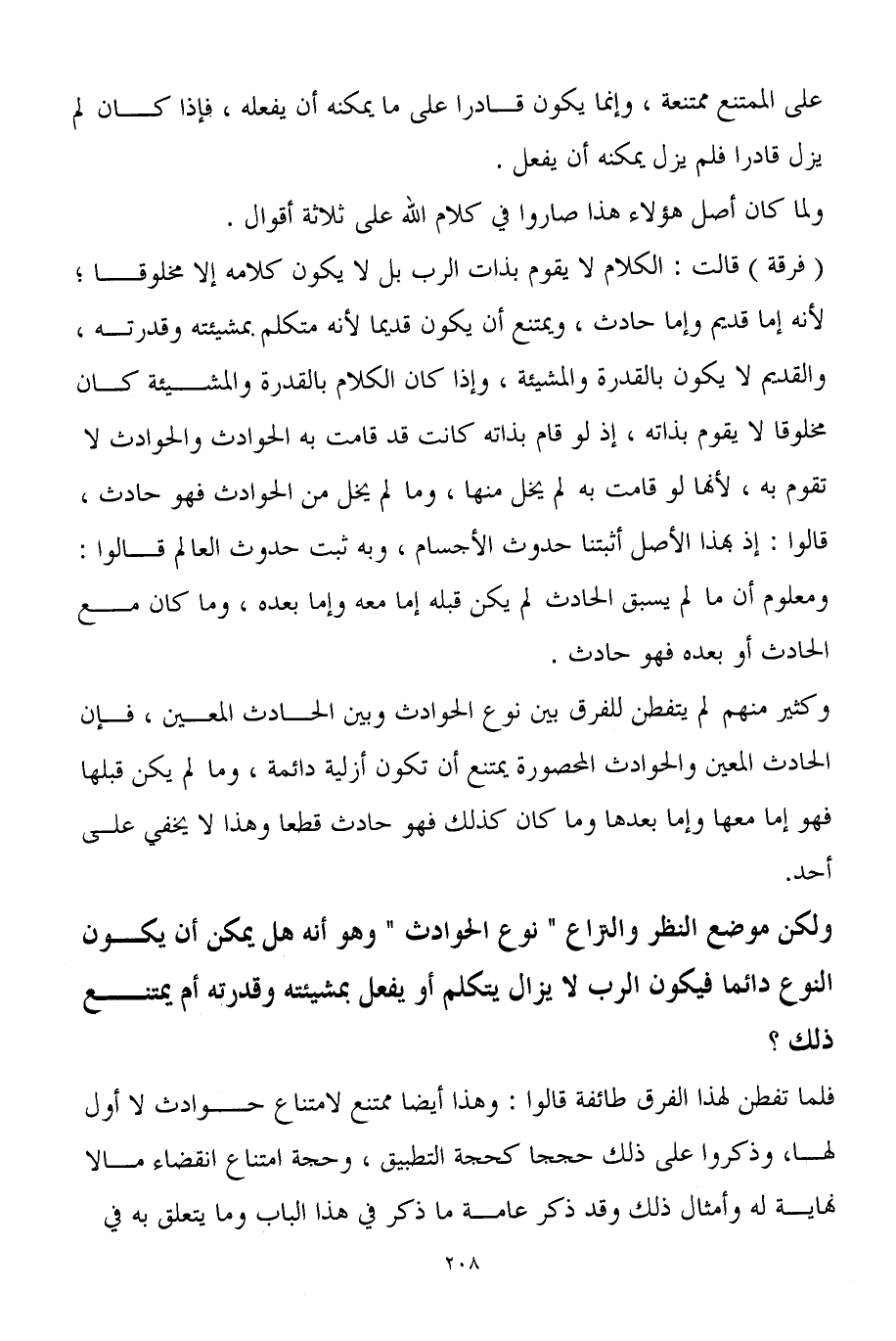 (فرقة) قالت: الكلام لا يقوم بذات الرب بل لا يكون كلامه إلا مخلوقاً؛ لأنه إما قديم وإما حادث، ويمتنع أن يكون قديماً لأنه متكلم بمشيئته وقدرته، والقديم لا يكون بالقدرة والمشيئة، وإذا كان الكلام بالقدرة والمشيئة كان مخلوقاً لا يقوم بذاته، إذ لو قام بذاته كانت قد قامت به الحوادث والحوادث لا تقوم به، لأنها لو قامت به لم يخل منها، وما لم يخل من الحوادث فهو حادث، قالوا: إذ بهذا الأصل أثبتنا حدوث الأجسام، وبه ثبت حدوث العالم قالوا: ومعلوم أن ما لم يسبق الحادث لم يكن قبله إما معه وإما بعده، وما كان مع الحادث أو بعده فهو حادث.