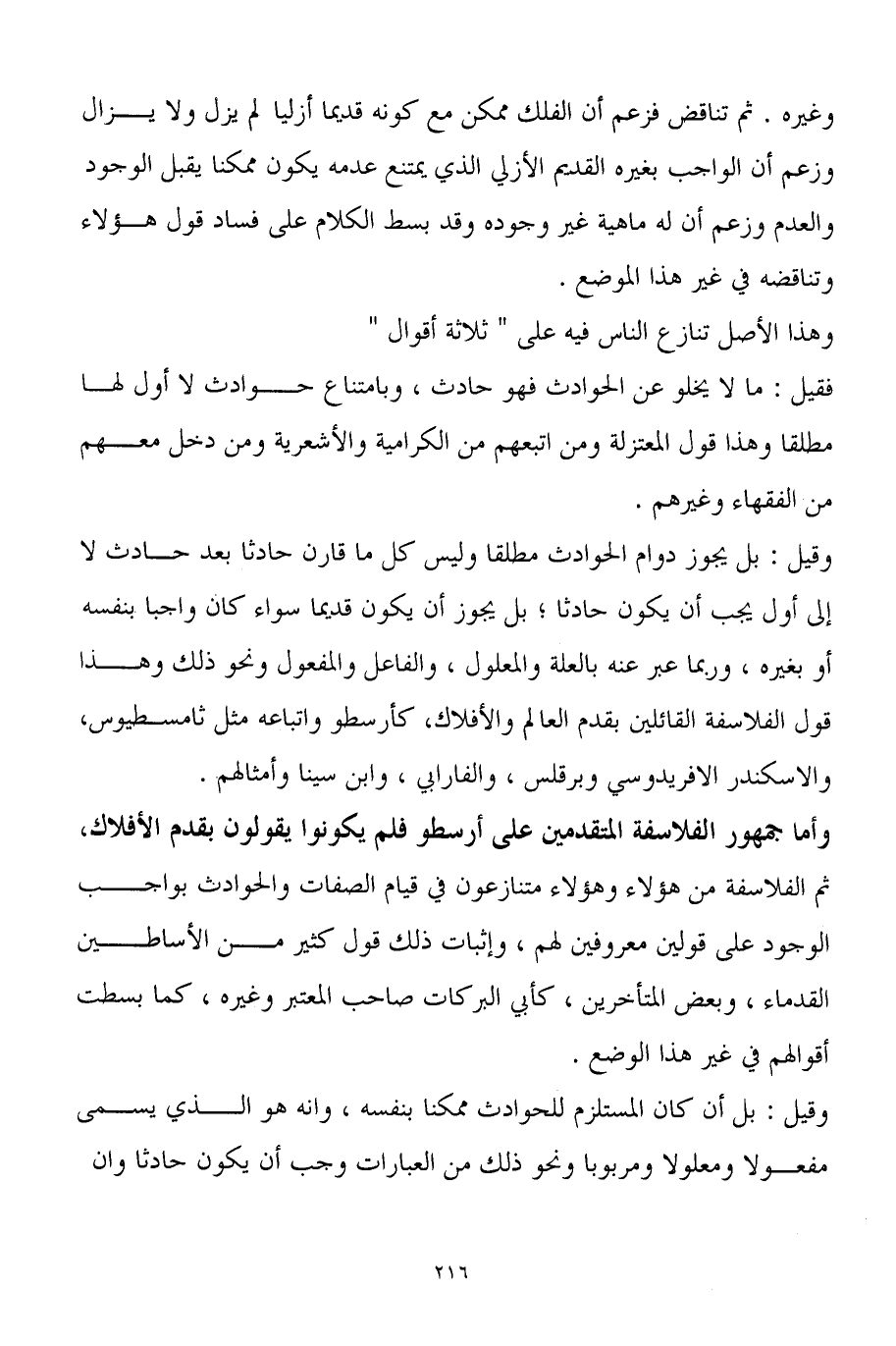 وأما جمهور الفلاسفة المتقدمين على أرسطو فلم يكونوا يقولون بقدم الأفلاك، ثم الفلاسفة من هؤلاء وهؤلاء متنازعون في قيام الصفات والحوادث بواجب الوجود على قولين معروفين لهم، وإثبات ذلك قول كثير من الأساطين القدماء، وبعض المتأخرين، كأبي البركات صاحب المعتبر وغيره، كما بسطت أقوالهم في غير هذا الوضع.