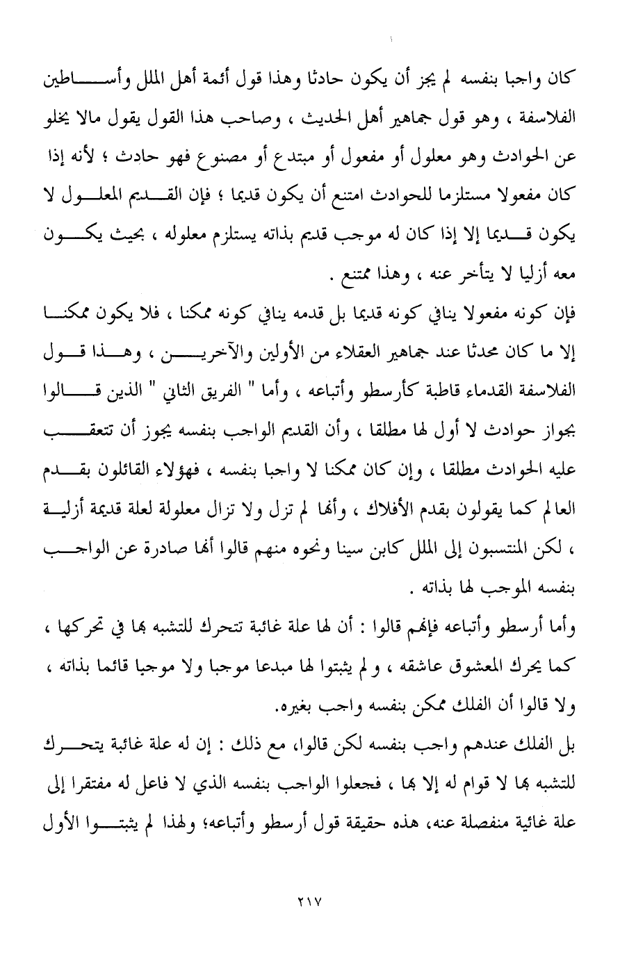 بل الفلك عندهم واجب بنفسه لكن قالوا، مع ذلك: إن له علة غائبة يتحرك للتشبه بها لا قوام له إلا بها، فجعلوا الواجب بنفسه الذي لا فاعل له مفتقراً إلى علة غائية منفصلة عنه، هذه حقيقة قول أرسطو وأتباعه؛ ولهذا لم يثبتوا الأول