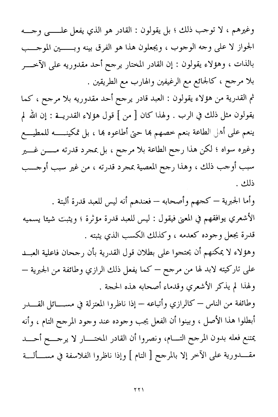 وطائفة من الناس - كالرازي وأتباعه - إذا ناظروا المعتزلة في مسائل القدر أبطلوا هذا الأصل، وبينوا أن الفعل يجب وجوده عند وجود المرجح التام، وأنه يمتنع فعله بدون المرجح التام، ونصروا أن القادر المختار لا يرجح أحد مقدورية على الآخر إلا بالمرجح [التام] وإذا ناظروا الفلاسفة في مسألة
