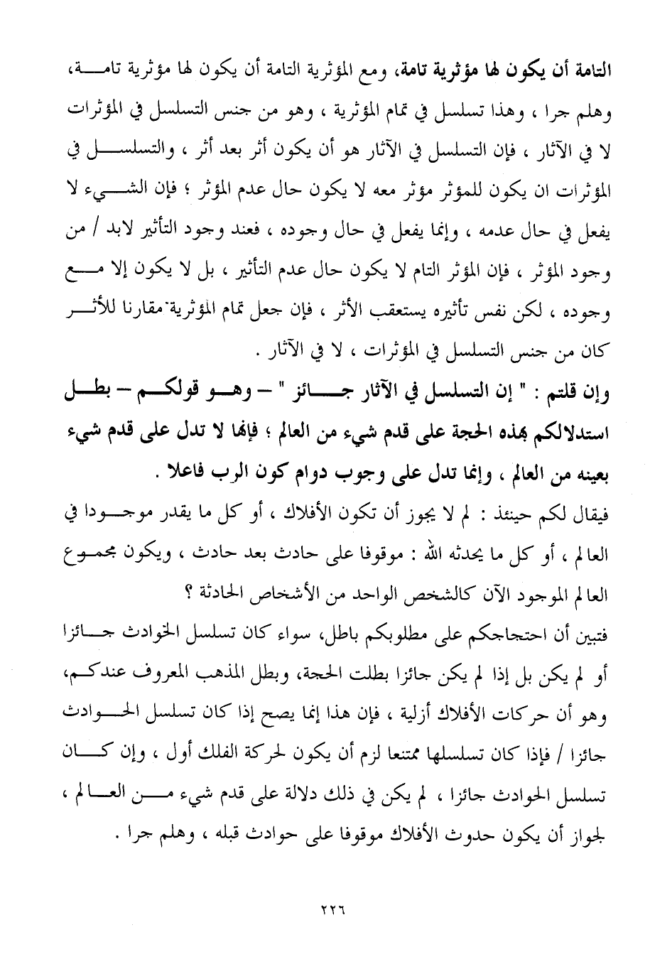 فتبين أن احتجاجكم على مطلوبكم باطل، سواء كان تسلسل الحوادث جائزاً أو لم يكن بل إذا لم يكن جائزاً بطلت الحجة، وبطل المذهب المعروف عندكم، وهو أن حركات الأفلاك أزلية، فإن هذا إنما يصح إذا كان تسلسل الحوادث جائزاً / فإذا كان تسلسلها ممتنعاً لزم أن يكون لحركة الفلك أول، وإن كان تسلسل الحوادث جائزاً، لم يكن في ذلك دلالة على قدم شيء من العالم، لجواز أن يكون حدوث الأفلاك موقوفاً على حوادث قبله، وهلم جرا.