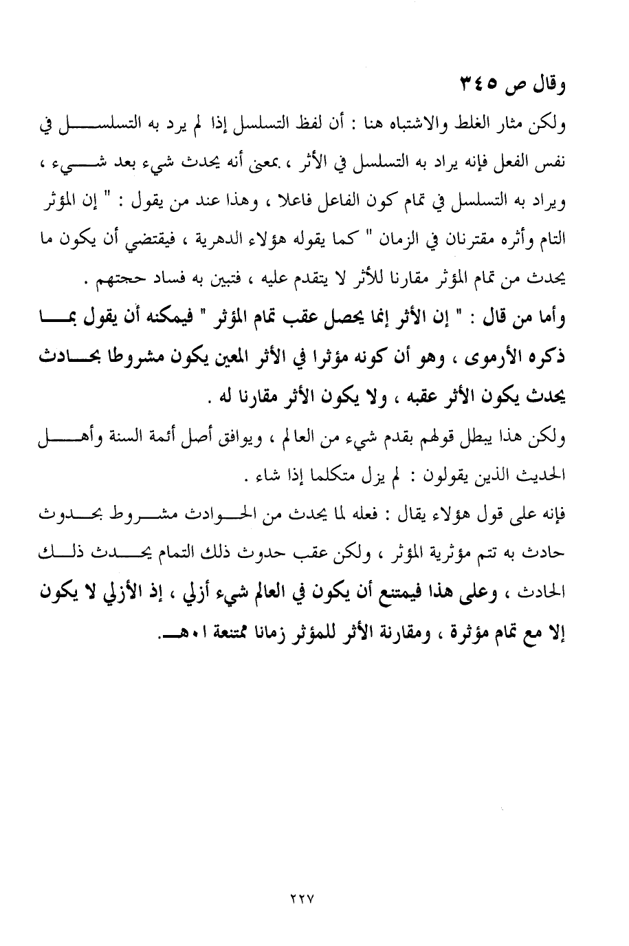 ولكن مثار الغلط والاشتباه هنا: أن لفظ التسلسل إذا لم يرد به التسلسل في نفس الفعل فإنه يراد به التسلسل في الأثر، بمعنى أنه يحدث شيء بعد شيء، ويراد به التسلسل في تمام كون الفاعل فاعلاً، وهذا عند من يقول: " إن المؤثر التام وأثره مقترنان في الزمان " كما يقوله هؤلاء الدهرية، فيقتضي أن يكون ما يحدث من تمام المؤثر مقارناً للأثر لا يتقدم عليه، فتبين به فساد حجتهم.