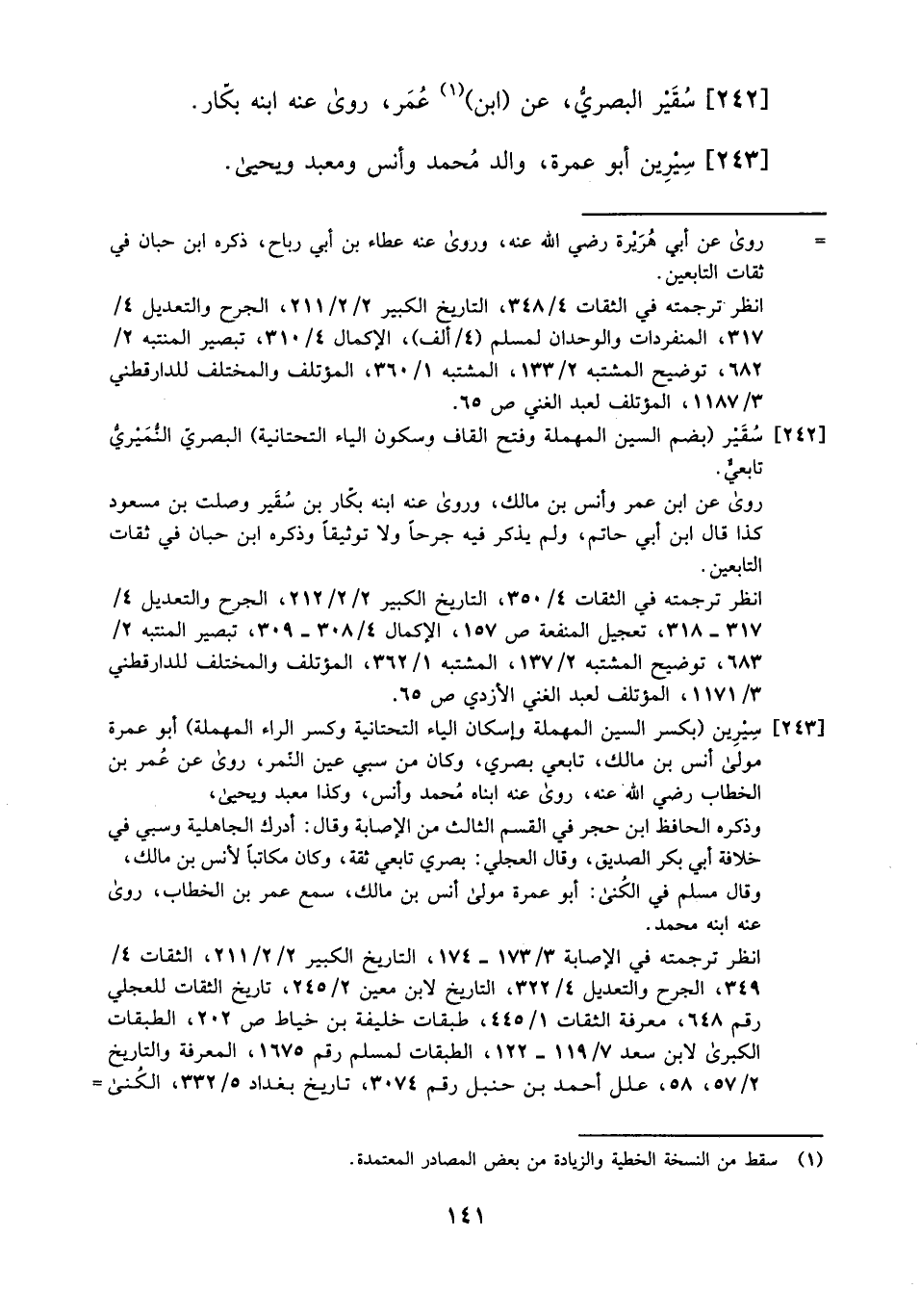 242- سقير البصري، عن (ابن) عمر، روى عنه ابنه بكار.