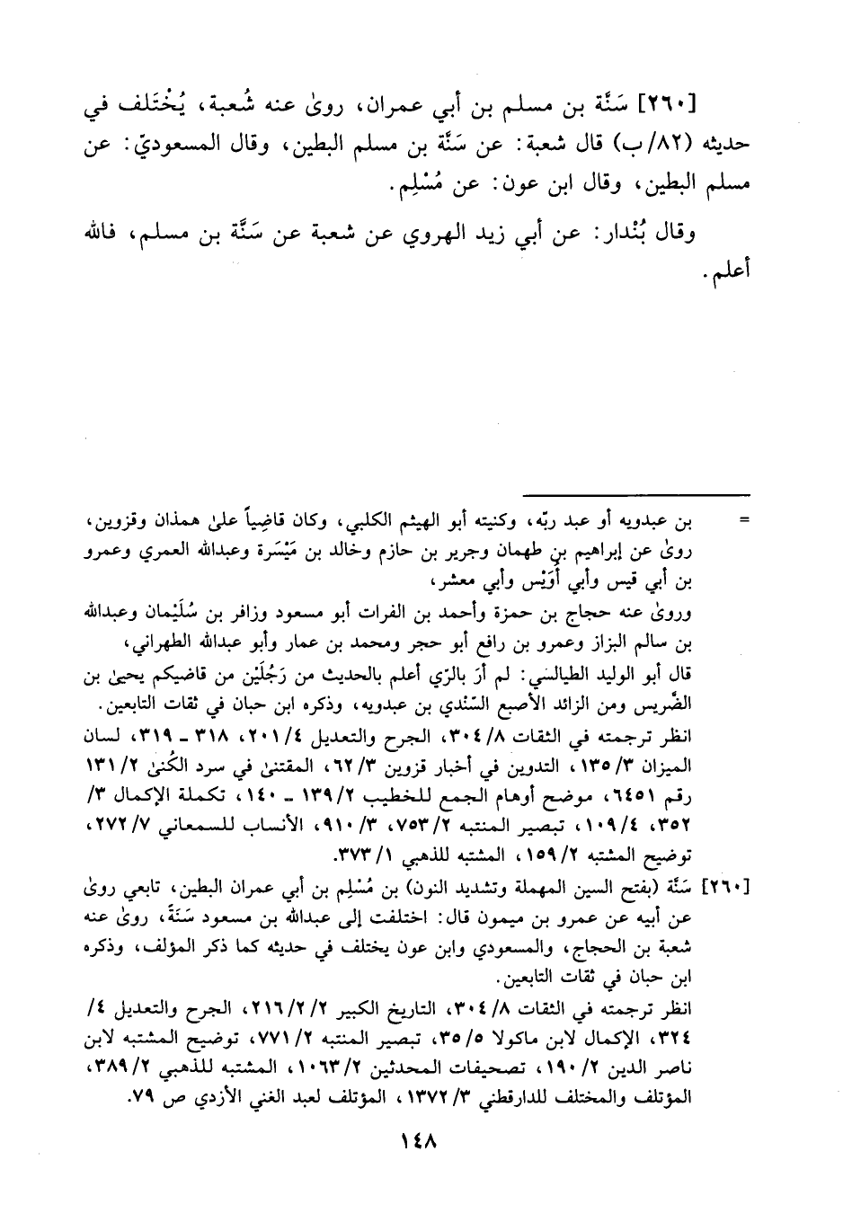 260- سنة بن مسلم بن أبي عمران، روى عنه شعبة، يختلف في حديثه قال شعبة: عن سنة بن مسلم البطين، وقال المسعودي: عن مسلم البطين، وقال ابن عون: عن مسلم.