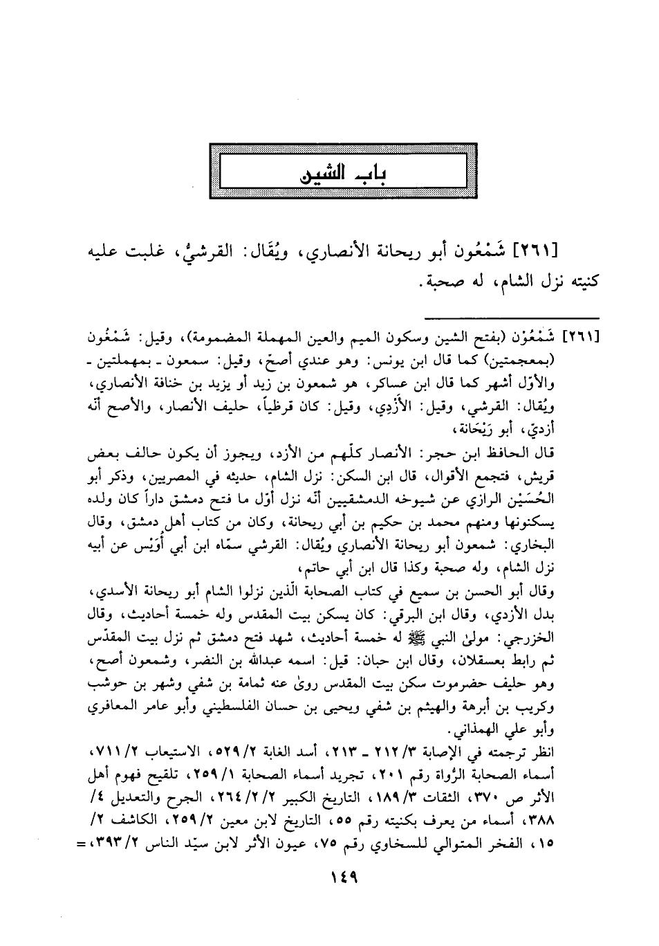 261- شمعون أبو ريحانة الأنصاري، ويقال: القرشي، غلبت عليه كنيته نزل الشام، له صحبة.