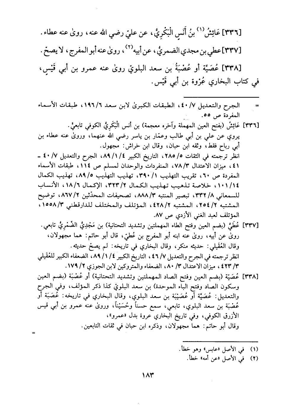 338- عصية أو عصبة بن سعد البلوي روى عنه عمرو بن أبي قيسٍ، في كتاب البخاري عروة بن أبي قيس.
