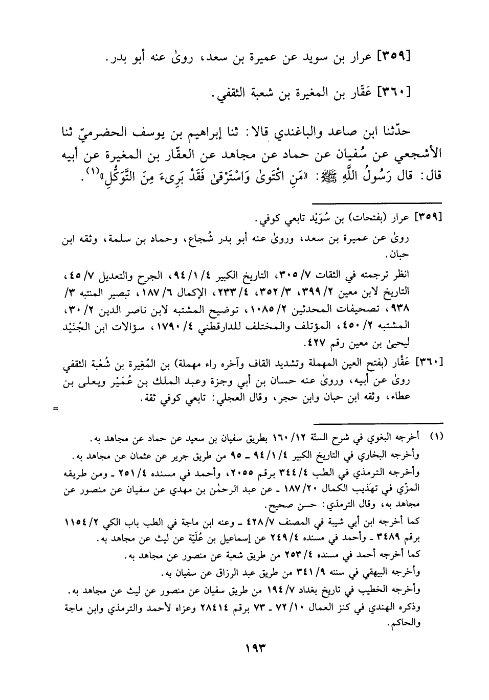 حدثنا ابن صاعد والباغندي قالا: ثنا إبراهيم بن يوسف الحضرمي ثنا الأشجعي عن سفيان عن حماد عن مجاهد عن العقار بن المغيرة عن أبيه قال: قال رسول الله صلى الله عليه وسلم: ((من اكتوى واسترقى فقد برئ من التوكل)) .