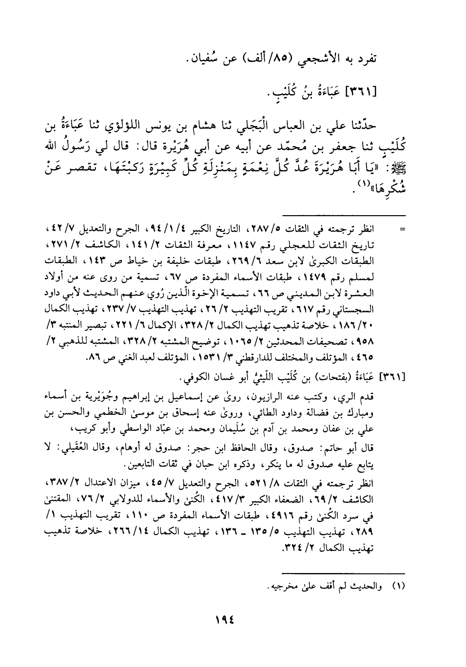 حدثنا علي بن العباس البجلي ثنا هشام بن يونس اللؤلؤي ثنا عباءة بن كليبٍ ثنا جعفر بن محمد عن أبيه عن أبي هريرة، قال: قال لي رسول الله صلى الله عليه وسلم: ((يا أبا هريرة عد كل نعمةٍ بمنزلة كل كبيرةٍ ركبتها، تقصر عن شكرها)) .