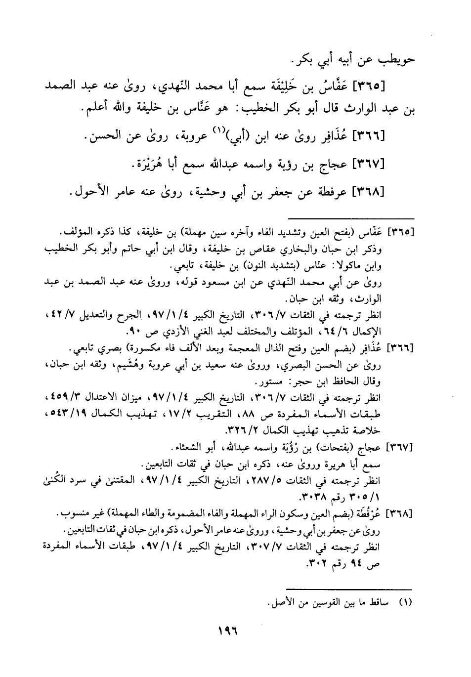 365- عفاس بن خليفة سمع أبا محمد النهدي، روى عنه عبد الصمد بن عبد الوارث قال أبو بكر الخطيب: هو عناس بن خليفة والله أعلم.