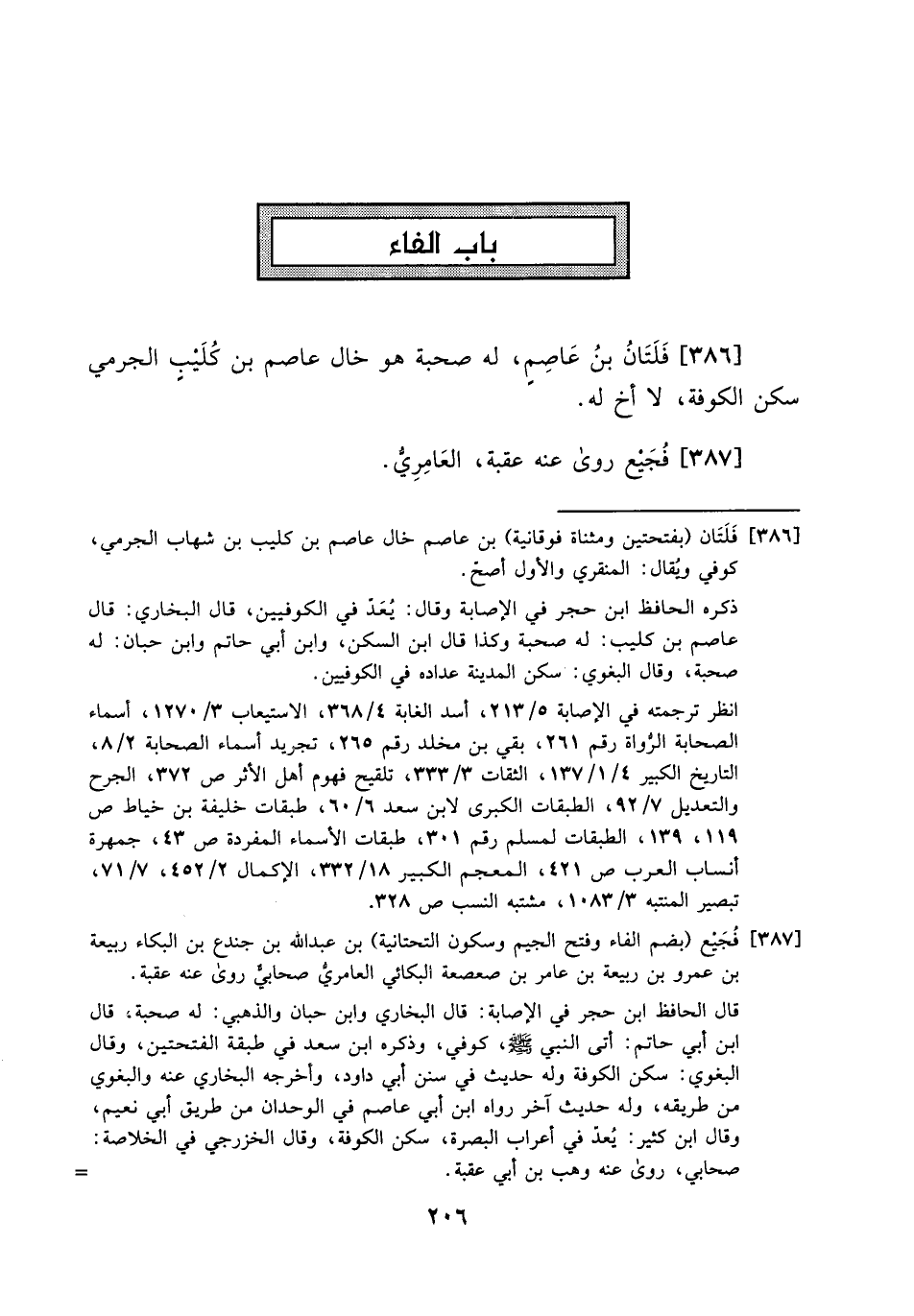 386- فلتان بن عاصمٍ، له صحبة هو خال عاصم بن كليب الجرمي سكن الكوفة، لا أخ له.