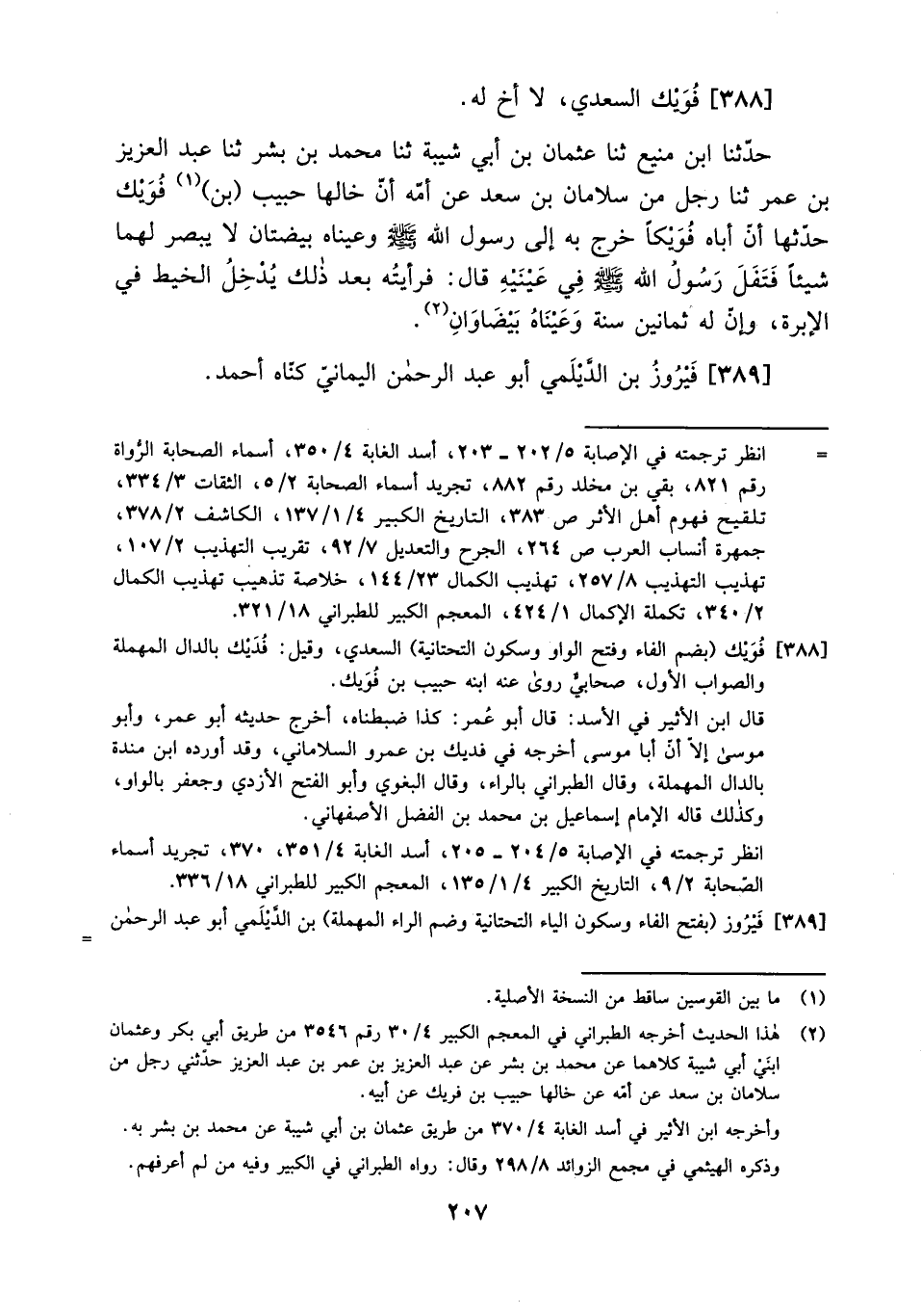 حدثنا ابن منيع ثنا عثمان بن أبي شيبة ثنا محمد بن بشر ثنا عبد العزيز بن عمر ثنا رجل من سلامان بن سعد عن أمه أن خالها حبيب (بن) فويك حدثها أن أباه فويكاً خرج به إلى رسول الله صلى الله عليه وسلم وعيناه بيضتان لا يبصر لهما شيئاً فتفل رسول الله صلى الله عليه وسلم في عينيه قال: فرأيته بعد ذلك يدخل الخيط في الإبرة، وإن له ثمانين سنة وعيناه بيضاوان.