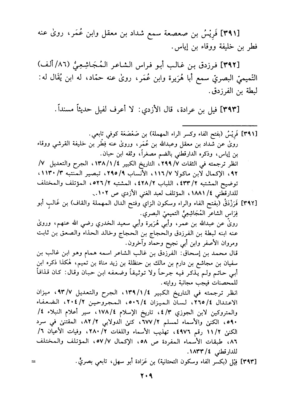 392- فرزدق بن غالب أبو فراس الشاعر المجاشعي التميمي البصري سمع أبا هريرة وابن عمر، روى عنه حماد، له ابن يقال له: لبطة بن الفرزدق.
