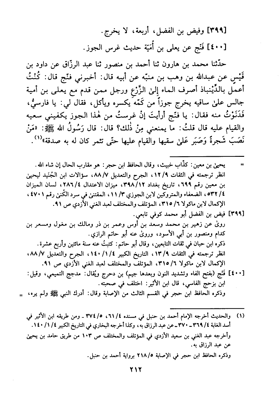 حدثنا محمد بن هارون ثنا أحمد بن منصور ثنا عبد الرزاق عن داود بن قيسٍ عن عبد الله بن وهب بن منبه عن أبيه قال: أخبرني فنج قال: كنت أعمل بالدينباذ أصرف الماء إلى الزرع ورجل ممن قدم مع يعلى بن أمية جالس على ساقيه يخرج جوزاً من كمه يكسره ويأكل، فقال لي: يا فارسي، فدنوت منه فقال: يا فنج أرأيت إن غرست من هذا الجوز يكفيني سعيه والقيام عليه قال قلت: ما يمنعني من ذلك؟ قال: قال رسول الله صلى الله عليه وسلم: ((من نصب شجرةً وصبر على سقيها والقيام عليها حتى تثمر كان له به صدقة)) .