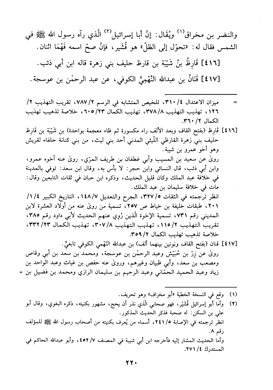 والنضر بن مخراق ويقال: إن أبا إسرائيل الذي رآه رسول الله صلى الله عليه وسلم في الشمس فقال له: ((تحول إلى الظل)) هو قشير، فإن صح اسمه فهما اثنان.