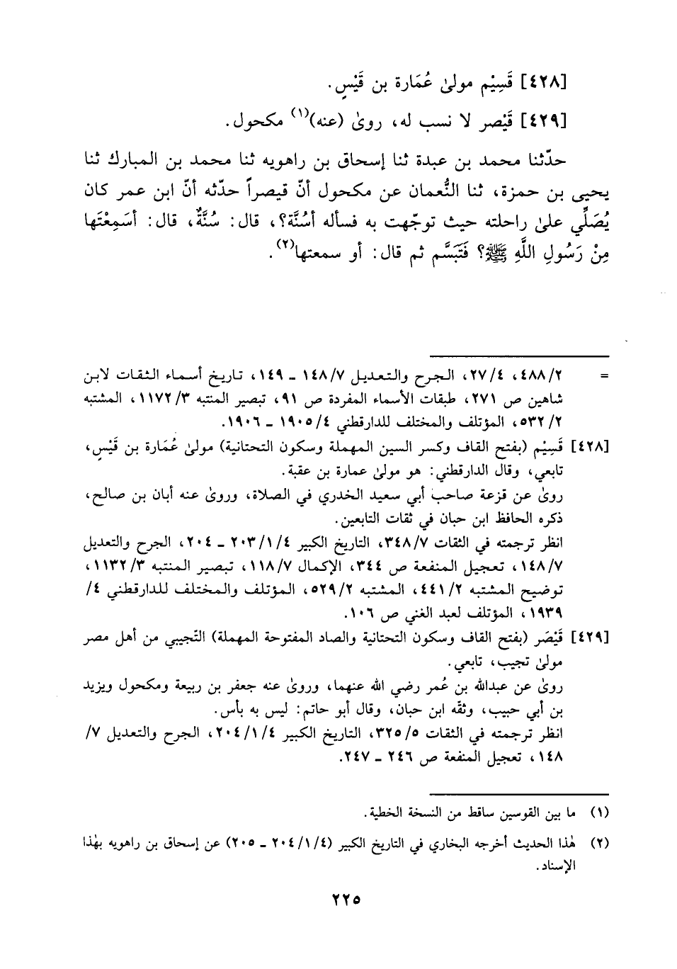 حدثنا محمد بن عبدة ثنا إسحاق بن راهويه ثنا محمد بن المبارك ثنا يحيى بن حمزة، ثنا النعمان عن مكحول أن قيصراً حدثه أن ابن عمر كان يصلي على راحلته حيث توجهت به فسأله أسنة؟، قال: سنةٌ، قال: أسمعتها من رسول الله صلى الله عليه وسلم؟ فتبسم ثم قال: أو سمعتها.