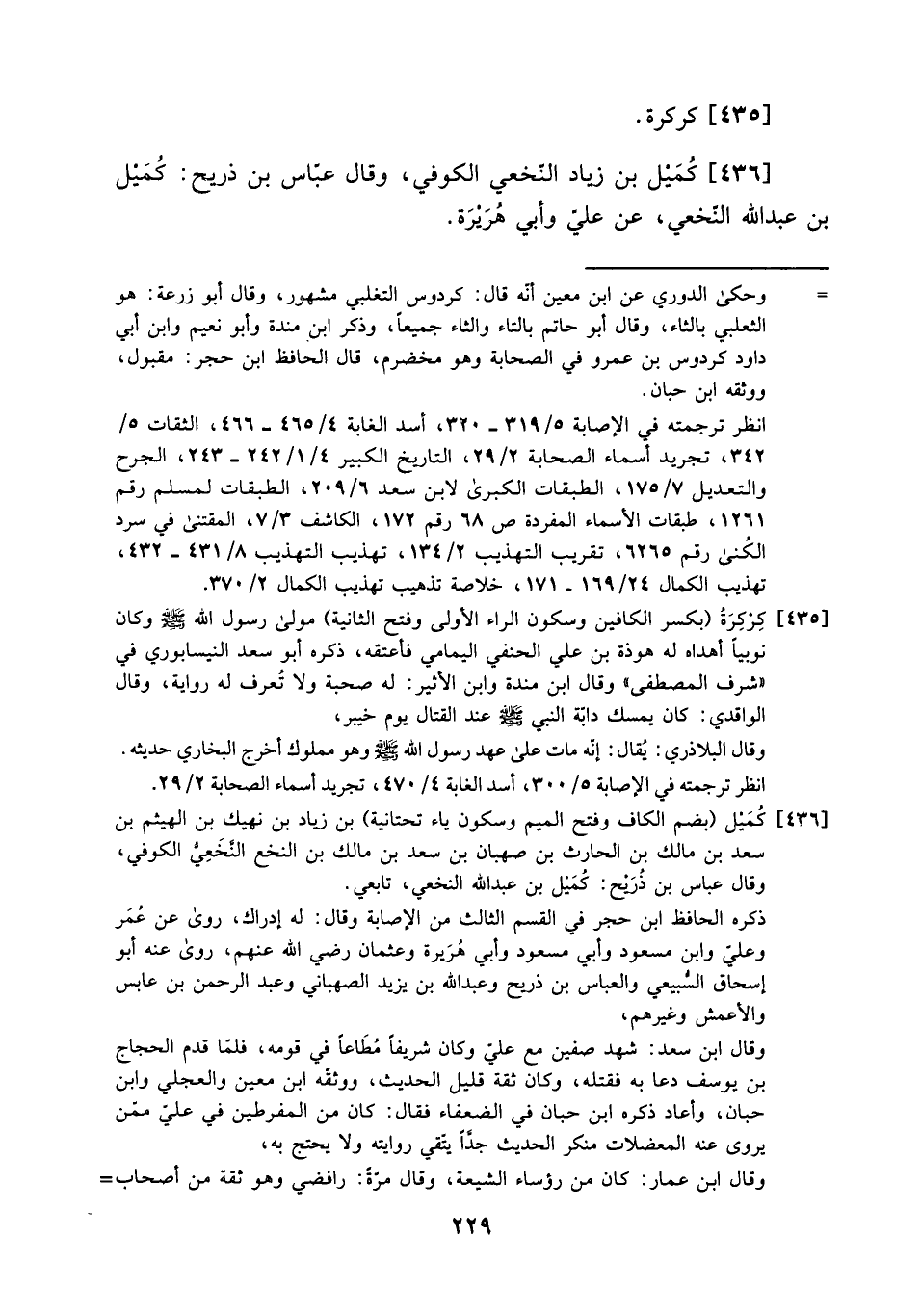 436- كميل بن زياد النخعي الكوفي، وقال عباس بن ذريح: كميل بن عبد الله النخعي، عن علي وأبي هريرة.