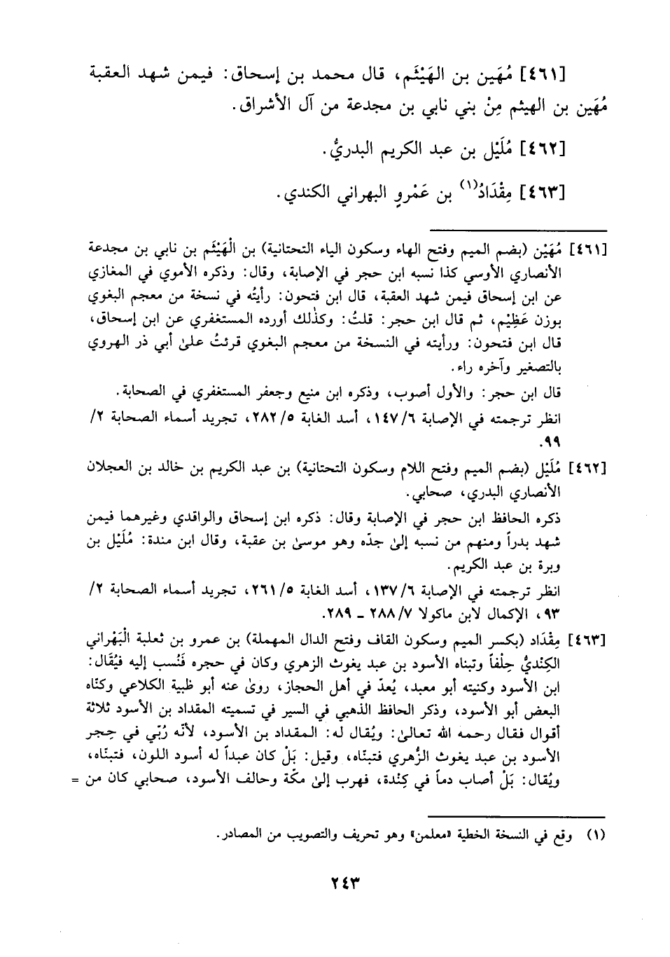 461- مهين بن الهيثم، قال محمد بن إسحاق: فيمن شهد العقبة مهين بن الهيثم من بني نابي بن مجدعة من آل الأشراق.