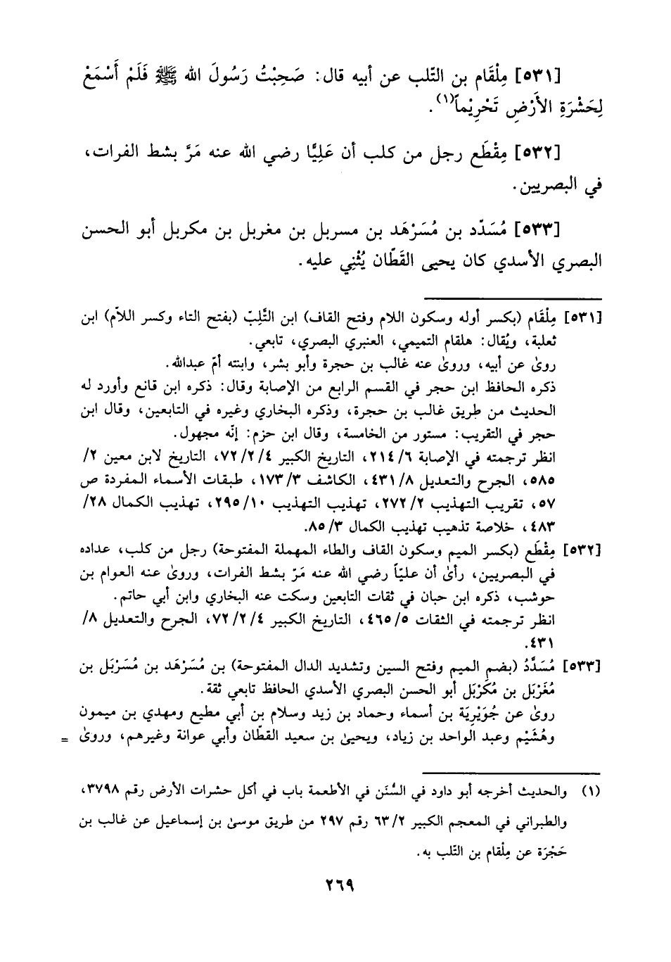 531- ملقام بن التلب عن أبيه قال: صحبت رسول الله صلى الله عليه وسلم فلم أسمع لحشرة الأرض تحريماً.