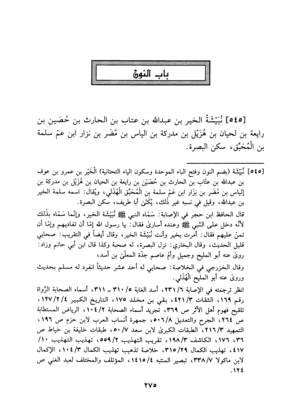 545- نبيشة الخير بن عبد الله بن عتاب بن الحارث بن حصين بن رايعة بن ليان بن هزيل بن مدركة بن إلياس بن مضر بن نزار ابن عم سلمة بن المحبق، سكن البصرة.