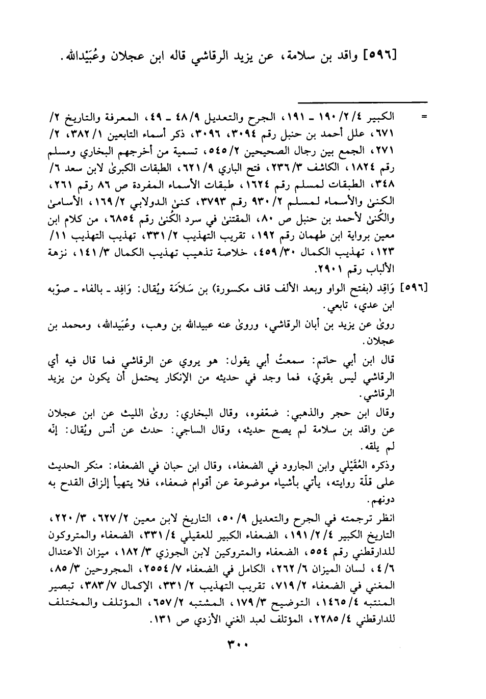 596- واقد بن سلامة، عن يزيد الرقاشي قاله ابن عجلان وعبيد الله.