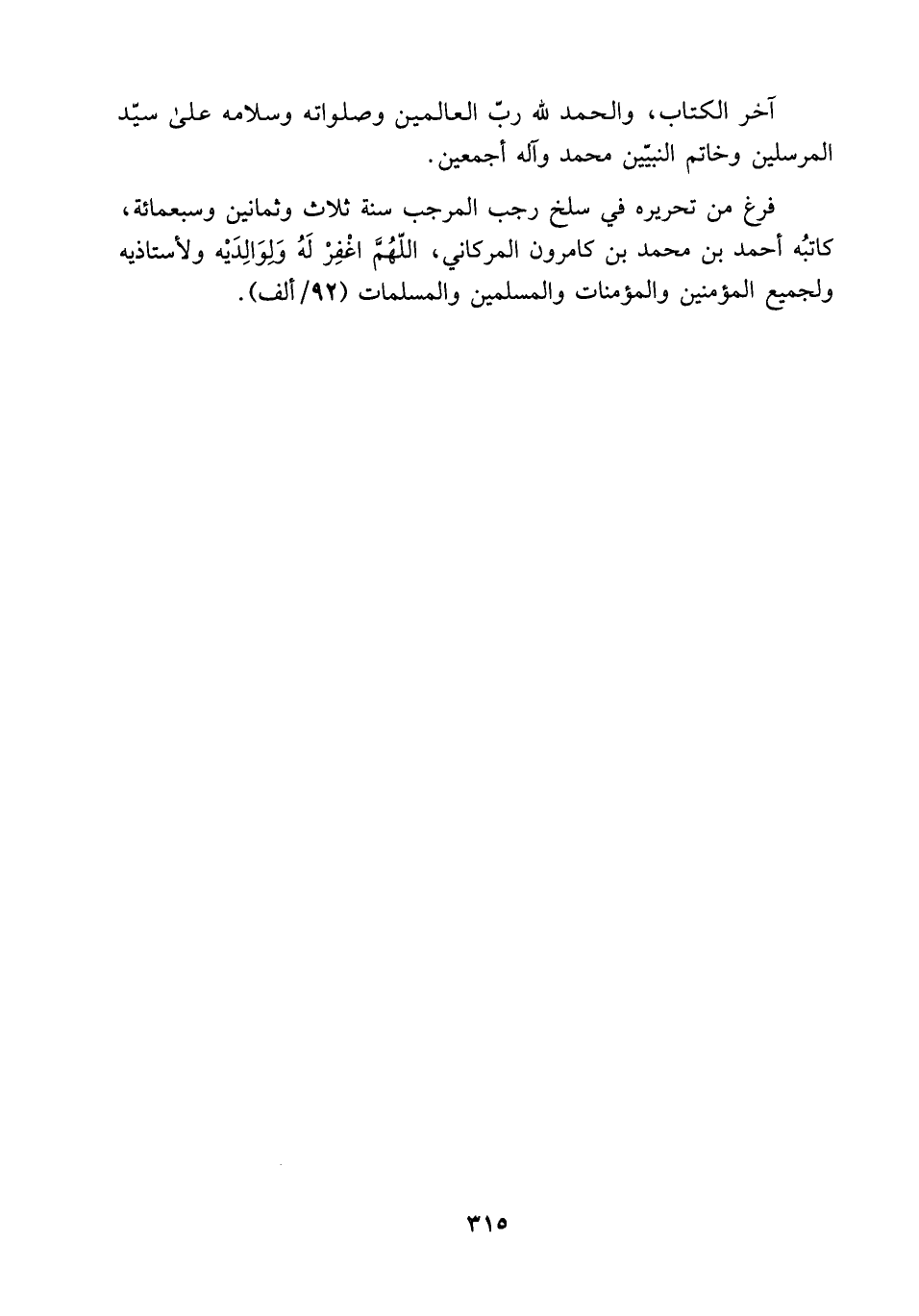 فرغ من تحريره في سلخ رجب المرجب سنة ثلاث وثمانين وسبعمائة، كاتبه أحمد بن محمد بن كامرون المركاني، اللهم اغفر له ولوالديه ولأستاذيه ولجميع المؤمنين والمؤمنات والمسلمين والمسلمات.