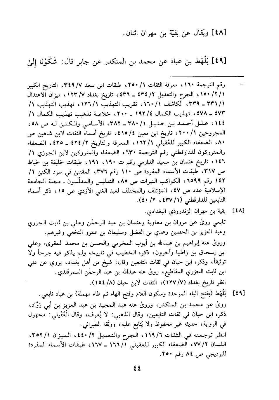 49- بلهط بن عباد عن محمد بن المنكدر عن جابر قال: شكونا إلى