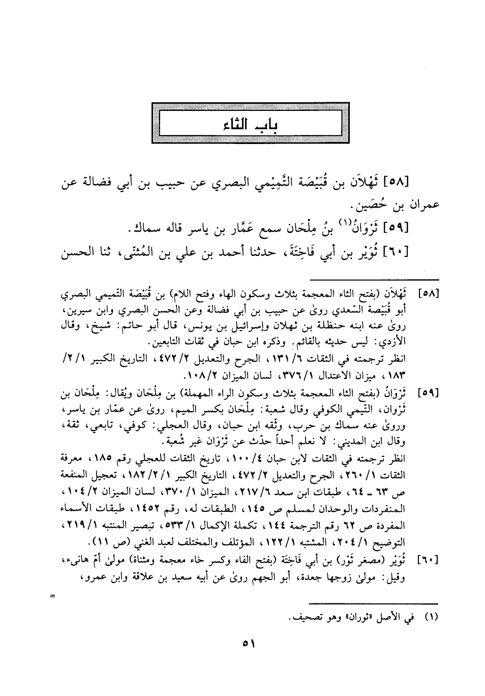 58- ثهلان بن قبيصة التميمي البصري عن حبيب بن أبي فضالة عن عمران بن حصين.
