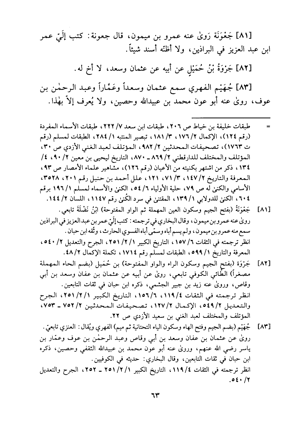 83- جهيم الفهري سمع عثمان وسعداً وعماراً وعبد الرحمن بن عوف، روى عنه أبو عون محمد بن عبيد الله وحصين، ولا يعرف إلا بهذا.