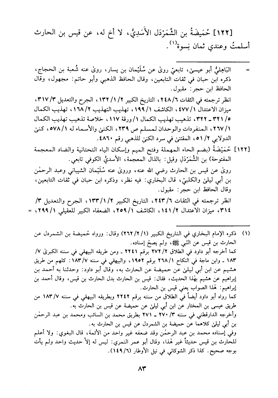 122- حميضة بن الشمردل الأسدي، لا أخ له، عن قيس بن الحارث أسلمت وعندي ثمان نسوة.