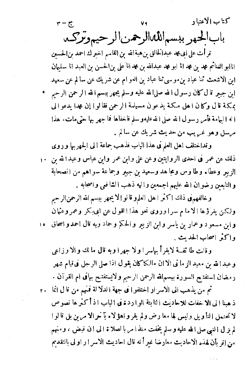 قَرَأْتُ عَلَى أَبِي مُحَمَّدٍ عَبْدِ الْخَالِقِ بْنِ هِبَةِ اللَّهِ بْنِ الْقَاسِمِ، أَخْبَرَكَ أَحْمَدُ بْنُ الْحَسَنِ، أَبُو الْغَنَائِمِ مُحَمَّدُ بْنُ مُحَمَّدٍ، أَبُو مُحَمَّدٍ عَبْدُ اللَّهِ بْنُ مُحَمَّدٍ، عَلِيُّ بْنُ الْحَسَنِ بْنِ الْعَبْدِ، سُلَيْمَانُ بْنُ الْأَشْعَثِ، عَبَّادُ بْنُ مُوسَى، حَدَّثَنَا عَبَّادُ بْنُ الْعَوَّامِ عَنْ شَرِيكٍ، عَنْ سَالِمٍ، عَنْ سَعِيدِ بْنِ جُبَيْرٍ، قَالَ: كَانَ رَسُولُ اللَّهِ - صَلَّى اللَّهُ عَلَيْهِ وَسَلَّمَ - يَجْهَرُ بِبِسْمِ اللَّهِ الرَّحْمَنِ الرَّحِيمِ بِمَكَّةَ، قَالَ: وَكَانَ أَهْلُ مَكَّةَ يَدْعُونَ مُسَيْلِمَةَ الرَّحْمَنِ، فَقَالُوا: إِنَّ مُحَمَّدًا يَدْعُو إِلَى إِلَهِ الْيَمَامَةِ، فَأُمِرَ رَسُولُ اللَّهِ - صَلَّى اللَّهُ عَلَيْهِ وَسَلَّمَ - فَأَخْفَاهَا، فَمَا جَهَرَ بِهَا حَتَّى مَاتَ.