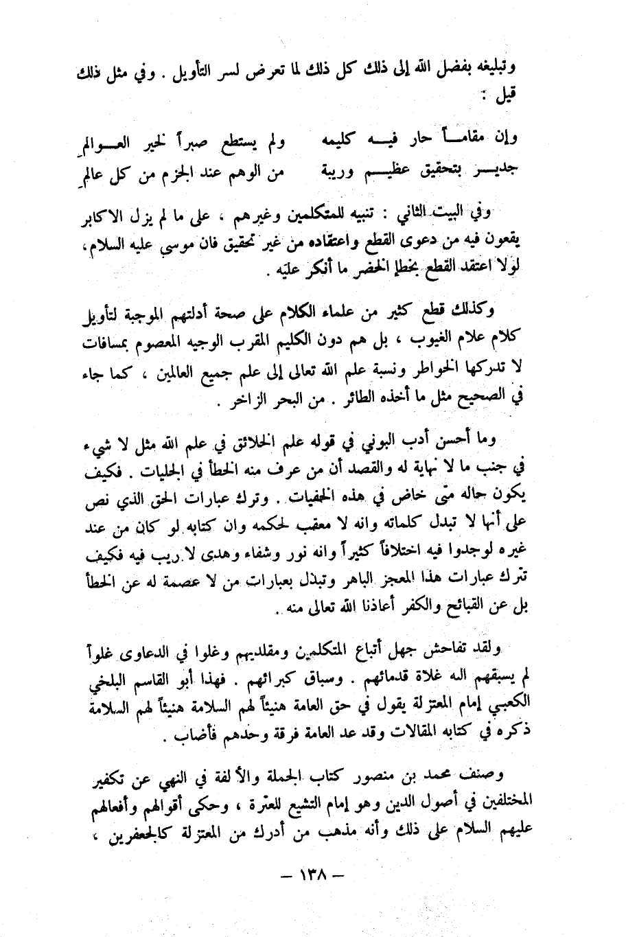 وَكَذَلِكَ قطع كثير من عُلَمَاء الْكَلَام على صِحَة أدلتهم الْمُوجبَة لتأويل كَلَام علام الغيوب بل هم دون الكليم المقرب الْوَجِيه الْمَعْصُوم بمسافات لَا تدركها الخواطر وَنسبَة علم الله تَعَالَى إِلَى علم جَمِيع الْعَالمين كَمَا جَاءَ فِي الصَّحِيح مثل مَا أَخذه الطَّائِر من الْبَحْر الزاخر