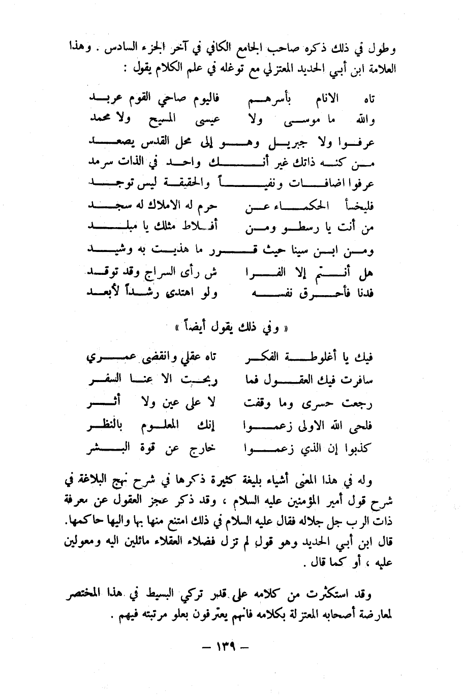 وَله فِي هَذَا الْمَعْنى أَشْيَاء بليغة كَثِيرَة ذكرهَا فِي شرح نهج البلاغة فِي شرح قَول أَمِير الْمُؤمنِينَ عَلَيْهِ السَّلَام وَقد ذكر عجز الْعُقُول عَن معرفَة ذَات الرب جلّ جَلَاله فَقَالَ عَلَيْهِ السَّلَام فِي ذَلِك امْتنع مِنْهَا بهَا واليها حاكمها قَالَ ابْن أبي الْحَدِيد وَهُوَ قَول لم تزل فضلاء الْعُقَلَاء مائلين اليه ومعولين عَلَيْهِ أَو كَمَا قَالَ