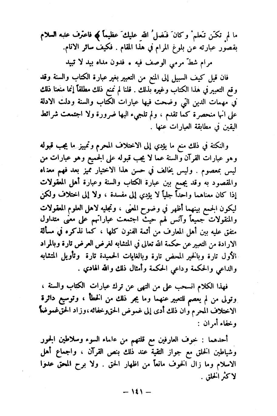 فَهَذَا الْكَلَام انسحب على من التهى عَن ترك عِبَارَات الْكتاب وَالسّنة وَتَوَلَّى من لم يعْصم للتعبير عَنْهُمَا وَمَا يجر ذَلِك من الْخَطَأ وتوسيع دَائِرَة الِاخْتِلَاف الْمحرم وان ذَلِك أدّى إِلَى غموض الْحق وخفائه وَزَاد الْحق غموضا وخفاء أَمْرَانِ