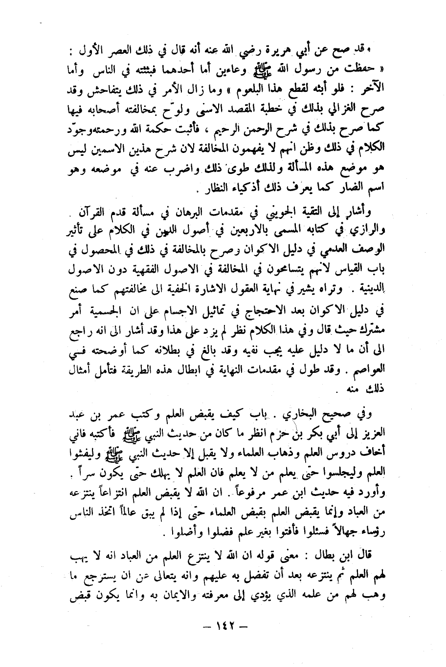 وَقد صَحَّ عَن أبي هُرَيْرَة رَضِي الله عَنهُ أَنه قَالَ فِي ذَلِك الْعَصْر الأول حفظت من رَسُول الله صلى الله عَلَيْهِ وَسلم وعاءين أما أَحدهمَا فبثثته فِي النَّاس وَأما الآخر فَلَو أبثه لقطع هَذَا البلعوم وَمَا زَالَ الْأَمر فِي ذَلِك يتفاحش وَقد صرح الْغَزالِيّ بذلك فِي خطْبَة الْمَقْصد الاسنى ولوح بمخالفته أَصْحَابه فِيهَا كَمَا صرح بذلك فِي شرح الرَّحْمَن الرَّحِيم فَأثْبت حِكْمَة الله وَرَحمته وجود الْكَلَام فِي ذَلِك وَظن أَنهم لَا يفهمون الْمُخَالفَة لَان شرح هذَيْن الاسمين لَيْسَ هُوَ مَوضِع هَذِه الْمَسْأَلَة وَلذَلِك طوى ذَلِك وَاضْرِبْ عَنهُ فِي مَوْضِعه وَهُوَ اسْم الضار كَمَا يعرف ذَلِك أذكياء النظار