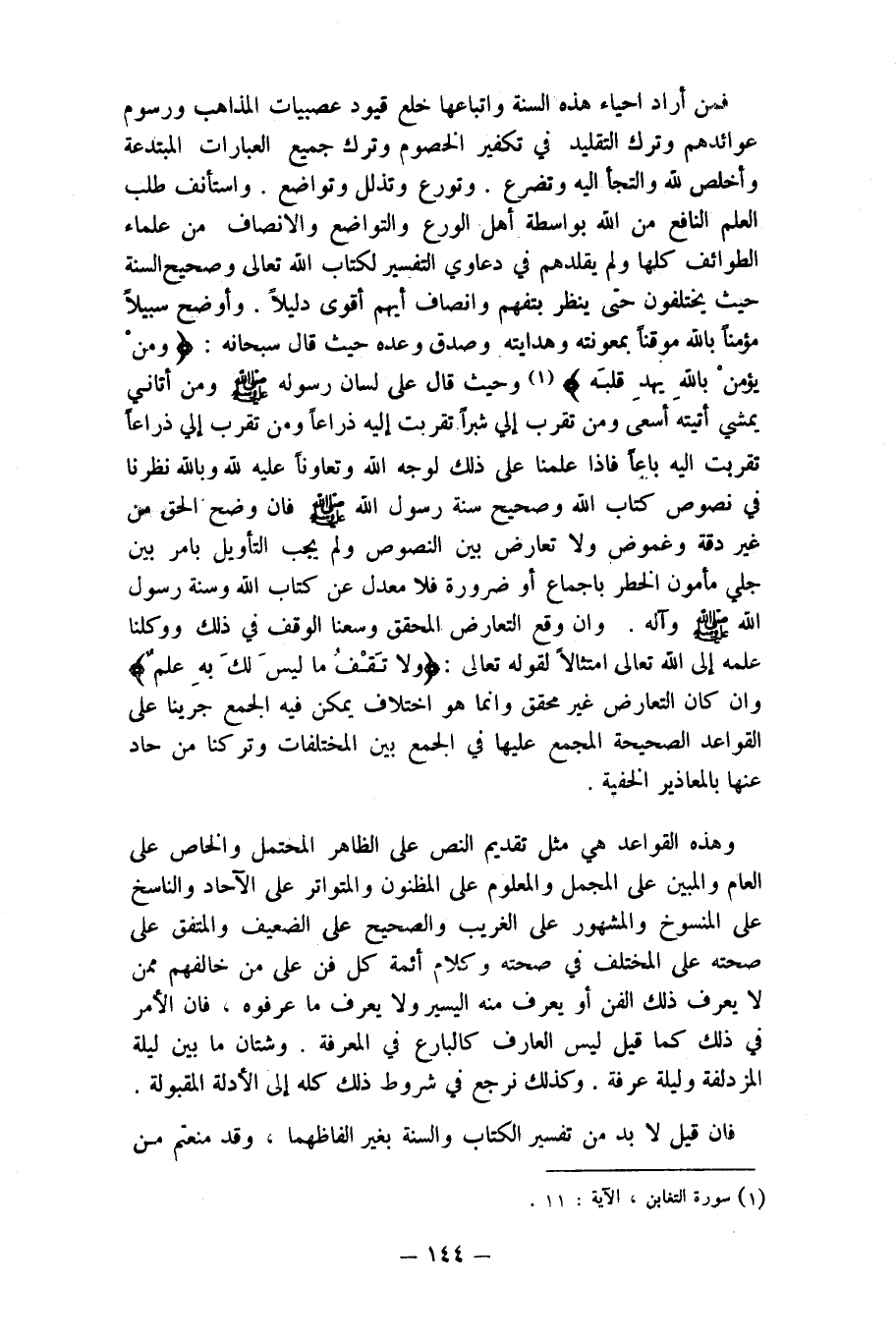 فَمن أَرَادَ احياء هَذِه السّنة واتباعها خلع قيود عصبيات الْمذَاهب ورسوم عوائدهم وَترك التَّقْلِيد فِي تَكْفِير الْخُصُوم وَترك جَمِيع الْعبارَات المبتدعة وأخلص لله والتجأ اليه وتضرع وتورع وتذلل وتواضع واستأنف طلب الْعلم النافع من الله بِوَاسِطَة أهل الْوَرع والتواضع والانصاف من عُلَمَاء الطوائف كلهَا وَلم يقلدهم فِي دعاوي التَّفْسِير لكتاب الله تَعَالَى وصحيح السّنة حَيْثُ يَخْتَلِفُونَ حَتَّى ينظر بتفهم وانصاف أَيهمْ أقوى دَلِيلا وأوضح سَبِيلا مُؤمنا بِاللَّه موقنا بمعونته وهدايته وَصدق وعده حَيْثُ قَالَ سُبْحَانَهُ {وَمن يُؤمن بِاللَّه يهد قلبه} وَحَيْثُ قَالَ على لِسَان رَسُوله صلى الله عَلَيْهِ وَسلم وَمن أَتَانِي يمشي أَتَيْته أسعى وَمن تقرب إِلَيّ شبْرًا تقربت إِلَيْهِ ذِرَاعا وَمن تقرب إِلَيّ ذِرَاعا تقربت اليه باعا فاذا علمنَا على ذَلِك لوجه الله وتعاونا عَلَيْهِ لله وَبِاللَّهِ نَظرنَا فِي نُصُوص كتاب الله وصحيح سنة رَسُول الله صلى الله عَلَيْهِ وَسلم فان وضح الْحق من غير دقة وغموض وَلَا تعَارض بَين النُّصُوص وَلم يجب التَّأْوِيل بامر بَين جلي مَأْمُون الْخطر باجماع أَو ضَرُورَة فَلَا معدل عَن كتاب الله وَسنة رَسُول الله صلى الله عَلَيْهِ وَسلم وَآله وان وَقع التَّعَارُض الْمُحَقق وسعنا الْوَقْف فِي ذَلِك ووكلنا علمه إِلَى الله تَعَالَى امتثالا لقَوْله تَعَالَى {وَلَا تقف مَا لَيْسَ لَك بِهِ علم} وان كَانَ التَّعَارُض غير مُحَقّق وانما هُوَ اخْتِلَاف يُمكن فِيهِ الْجمع جرينا على الْقَوَاعِد الصَّحِيحَة الْمجمع عَلَيْهَا فِي الْجمع بَين المختلفات وَتَركنَا من حاد عَنْهَا بالمعاذير الْخفية
