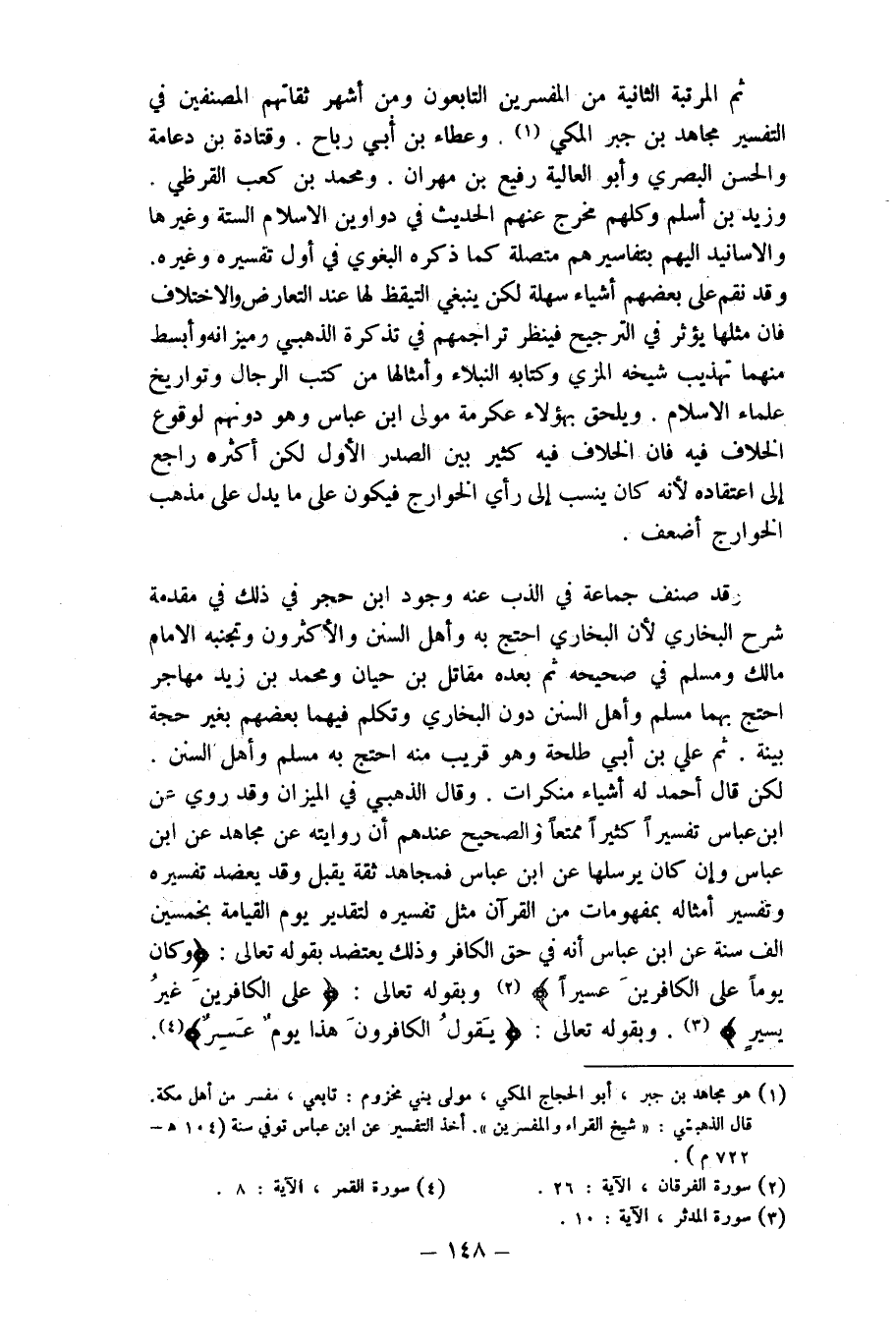 ثمَّ الْمرتبَة الثَّانِيَة من الْمُفَسّرين التابعون وَمن أشهر ثقاتهم المصنفين فِي التَّفْسِير مُجَاهِد بن جبر الْمَكِّيّ وَعَطَاء بن أبي رَبَاح وَقَتَادَة بن دعامة وَالْحسن الْبَصْرِيّ وَأَبُو الْعَالِيَة رفيع بن مهْرَان وَمُحَمّد بن كَعْب الْقرظِيّ وَزيد بن أسلم وَكلهمْ مخرج عَنْهُم الحَدِيث فِي دواوين الاسلام السِّتَّة وَغَيرهَا والاسانيد اليهم بتفاسيرهم مُتَّصِلَة كَمَا ذكره الْبَغَوِيّ فِي أول تَفْسِيره وَغَيره وَقد نقم على بَعضهم أَشْيَاء سهلة لَكِن يَنْبَغِي التيقظ لَهَا عِنْد التَّعَارُض وَالِاخْتِلَاف فان مثلهَا يُؤثر فِي التَّرْجِيح فَينْظر تراجمهم فِي تذكرة الذَّهَبِيّ وميزانه وأبسط مِنْهُمَا تَهْذِيب شَيْخه الْمزي وَكتابه النبلاء وأمثالها من كتب الرِّجَال وتواريخ عُلَمَاء الاسلام وَيلْحق بهؤلاء عِكْرِمَة مولى ابْن عَبَّاس وَهُوَ دونهم لوُقُوع الْخلاف فِيهِ فان الْخلاف فِيهِ كثير بَين الصَّدْر الأول لَكِن أَكْثَره رَاجع إِلَى اعْتِقَاده لِأَنَّهُ كَانَ ينْسب إِلَى رَأْي الْخَوَارِج فَيكون على مَا يدل على مَذْهَب الْخَوَارِج أَضْعَف