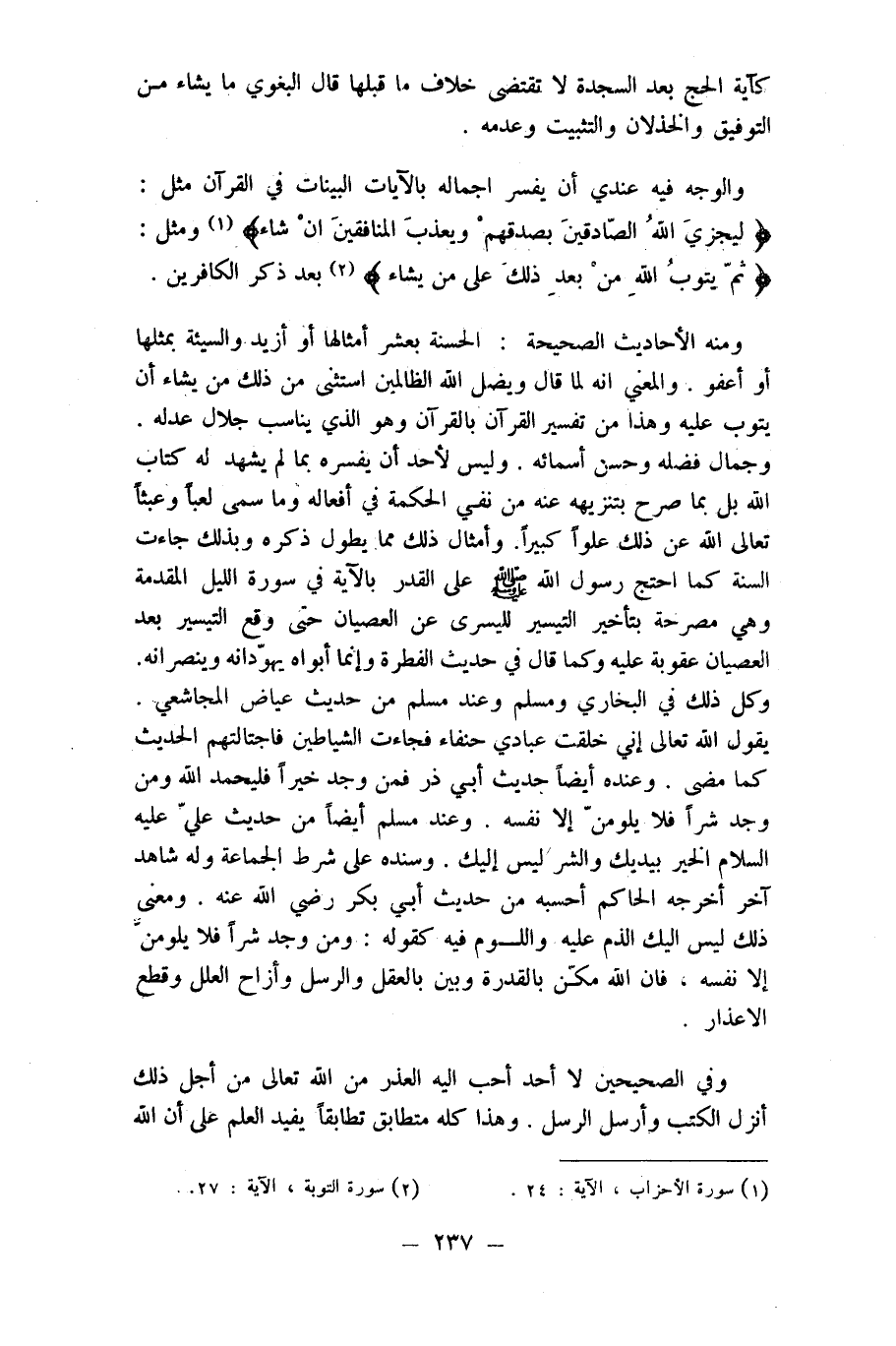وَمِنْه الْأَحَادِيث الصَّحِيحَة الْحَسَنَة بِعشر أَمْثَالهَا أَو أَزِيد والسيئة بِمِثْلِهَا أَو أعفو والمعني انه لما قَالَ ويضل الله الظَّالِمين اسْتثْنى من ذَلِك من يَشَاء أَن يَتُوب عَلَيْهِ وَهَذَا من تَفْسِير الْقُرْآن بِالْقُرْآنِ وَهُوَ الَّذِي يُنَاسب جلال عدله وجمال فَضله وَحسن أَسْمَائِهِ وَلَيْسَ لأحد أَن يفسره بِمَا لم يشْهد لَهُ كتاب الله بل بِمَا صرح بتنزيهه عَنهُ من نفي الْحِكْمَة فِي أَفعاله وَمَا سمى لعبا وعبثا تَعَالَى الله عَن ذَلِك علوا كَبِيرا وأمثال ذَلِك مِمَّا يطول ذكره وَبِذَلِك جَاءَت السّنة كَمَا احْتج رَسُول الله صلى الله عَلَيْهِ وَسلم على الْقدر بِالْآيَةِ فِي سُورَة اللَّيْل الْمُقدمَة وَهِي مصرحة بِتَأْخِير التَّيْسِير لليسرى عَن الْعِصْيَان حَتَّى وَقع التَّيْسِير بعد الْعِصْيَان عُقُوبَة عَلَيْهِ وكما قَالَ فِي حَدِيث الْفطْرَة وَإِنَّمَا أَبَوَاهُ يُهَوِّدَانِهِ وَيُنَصِّرَانِهِ وكل ذَلِك فِي البُخَارِيّ وَمُسلم وَعند مُسلم من حَدِيث عِيَاض الْمُجَاشِعِي يَقُول الله تَعَالَى إِنِّي خلقت عبَادي حنفَاء فَجَاءَت الشَّيَاطِين فَاجْتَالَتْهُمْ الحَدِيث كَمَا مضى وَعِنْده أَيْضا حَدِيث أبي ذَر فَمن وجد خيرا فليحمد الله وَمن وجد شرا فَلَا يَلُومن إِلَّا نَفسه وَعند مُسلم أَيْضا من حَدِيث عَليّ عَلَيْهِ السَّلَام الْخَيْر بيديك وَالشَّر لَيْسَ إِلَيْك وَسَنَده على شَرط الْجَمَاعَة وَله شَاهد آخر أخرجه الْحَاكِم أَحْسبهُ من حَدِيث أبي بكر رَضِي الله عَنهُ وَمعنى ذَلِك لَيْسَ اليك الذَّم عَلَيْهِ واللوم فِيهِ كَقَوْلِه وَمن وجد شرا فَلَا يَلُومن إِلَّا نَفسه فان الله مكن بِالْقُدْرَةِ وَبَين بِالْعقلِ وَالرسل وأزاح الْعِلَل وَقطع الاعذار