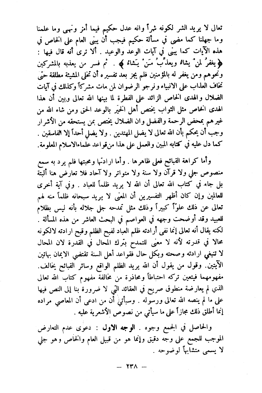 تَعَالَى لَا يُرِيد الشَّرّ لكَونه شرا وانه عدل حَكِيم فِيمَا أَمر وَنهى وَمَا علمنَا وَمَا جهلنا كَمَا مضى فِي مَسْأَلَة حَكِيم فَيجب أَن يبْنى الْعَام على الْخَاص فِي هَذِه الْآيَات كَمَا يَبْنِي فِي آيَات الْوَعْد والوعيد أَلا ترى أَنه قَالَ فِيهَا {يغْفر لمن يَشَاء ويعذب من يَشَاء} ثمَّ فسر من يعذبه بالمشركين وَنَحْوهم وَمن يغْفر لَهُ بِالْمُؤْمِنِينَ فَلم يجز بعد تَفْسِيره أَن تخلى الْمَشِيئَة مُطلقَة حَتَّى تخَاف الْعَذَاب على الانبياء وَنَرْجُو الرضْوَان لمن مَاتَ مُشْركًا وَكَذَلِكَ فِي آيَات الضلال وَالْهدى الْخَاص الزَّائِد على الْفطْرَة لما بَينهَا الله تَعَالَى وَبَين أَن هَذَا الْهدى الْخَاص مثل الثَّوَاب يخْتَص أهل الْخَيْر بالوعد الْحق وَمن شَاءَ الله من غَيرهم بمحض الرَّحْمَة وَالْفضل وان الضلال يخْتَص بِمن يسْتَحقّهُ من الأشرار وَجب أَن يحكم بِأَن الله تَعَالَى لَا يضل المهتدين وَلَا يضل أحدا إِلَّا الْفَاسِقين كَمَا دلّ عَلَيْهِ فِي كِتَابه الْمُبين وَالْعَمَل على هَذَا من قَوَاعِد عُلَمَاء الاسلام الْمَعْلُومَة
