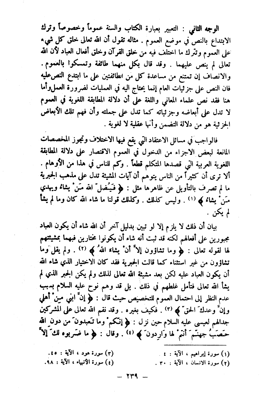 فَالْوَاجِب فِي مسَائِل الِاعْتِقَاد الَّتِي يَقع فِيهَا الِاخْتِلَاف وَتجوز المخصصات الْمَانِعَة لبَعض الْأَجْزَاء من الدُّخُول فِي الْعُمُوم الِاقْتِصَار على دلَالَة الْمُطَابقَة اللُّغَوِيَّة الْعَرَبيَّة الَّتِي قَصدهَا الْمُتَكَلّم قطعا وَكم للنَّاس فِي هَذَا من الأوهام أَلا ترى أَن كثيرا من النَّاس يتَوَهَّم أَن آيَات الْمَشِيئَة تدل على مَذْهَب الجبرية مَا لم تصرف بالتأويل عَن ظَاهرهَا مثل {فيضل الله من يَشَاء وَيهْدِي من يَشَاء} وَلَيْسَ كَذَلِك وَكَذَلِكَ قَوْلنَا مَا شَاءَ الله كَانَ وَمَا لم يَشَأْ لم يكن