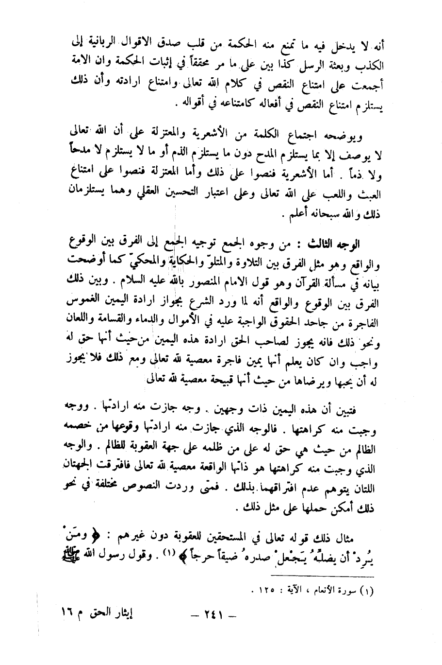 أَنه لَا يدْخل فِيهِ مَا تمنع مِنْهُ الْحِكْمَة من قلب صدق الاقوال الربانية إِلَى الْكَذِب وبعثة الرُّسُل كَذَا بَين على مَا مر محققا فِي إِثْبَات الْحِكْمَة وان الامة أَجمعت على امْتنَاع النَّقْص فِي كَلَام الله تَعَالَى وَامْتِنَاع ارادته وَأَن ذَلِك يسْتَلْزم امْتنَاع النَّقْص فِي أَفعاله كامتناعه فِي أَقْوَاله
