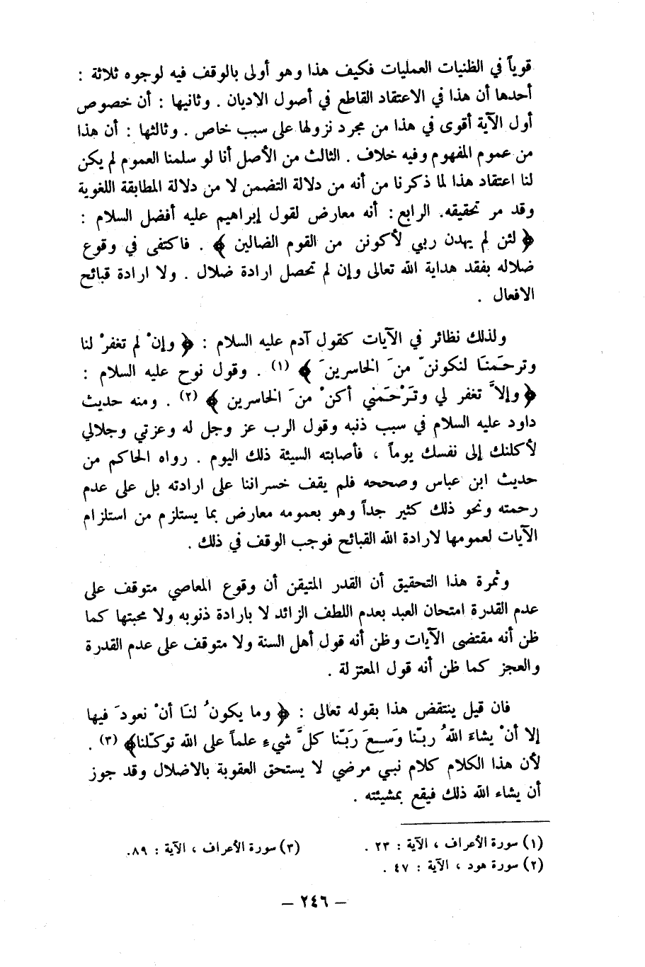 وَلذَلِك نَظَائِر فِي الْآيَات كَقَوْل آدم عَلَيْهِ السَّلَام {وَإِن لم تغْفر لنا وترحمنا لنكونن من الخاسرين} وَقَول نوح عَلَيْهِ السَّلَام {وَإِلَّا تغْفر لي وترحمني أكن من الخاسرين} وَمِنْه حَدِيث دَاوُد عَلَيْهِ السَّلَام فِي سَبَب ذَنبه وَقَول الرب عز وَجل لَهُ وَعِزَّتِي وَجَلَالِي لأكلنك إِلَى نَفسك يَوْمًا فأصابته السَّيئَة ذَلِك الْيَوْم رَوَاهُ الْحَاكِم من حَدِيث ابْن عَبَّاس وَصَححهُ فَلم يقف خسراننا على ارادته بل على عدم رَحمته وَنَحْو ذَلِك كثير جدا وَهُوَ بِعُمُومِهِ معَارض بِمَا يسْتَلْزم من استلزام الْآيَات لعمومها لارادة الله القبائح فَوَجَبَ الْوَقْف فِي ذَلِك