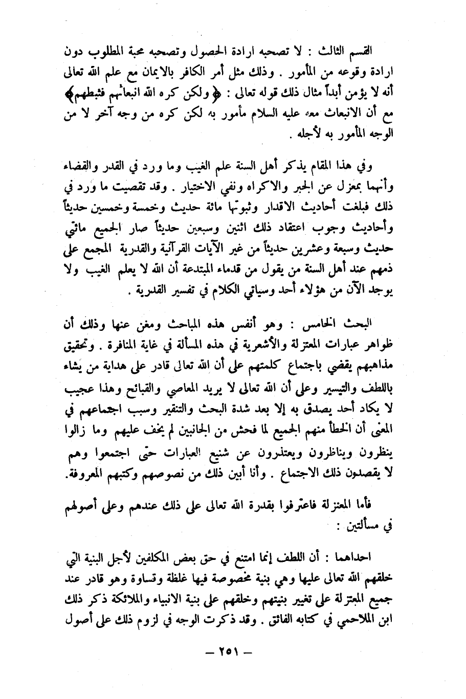 وَفِي هَذَا الْمقَام يذكر أهل السّنة علم الْغَيْب وَمَا ورد فِي الْقدر وَالْقَضَاء وأنهما بمعزل عَن الْجَبْر والاكراه وَنفي الِاخْتِيَار وَقد تقصيت مَا ورد فِي ذَلِك فبلغت أَحَادِيث الأقدار وثبوتها مائَة حَدِيث وَخَمْسَة وَخمسين حَدِيثا وَأَحَادِيث وجوب اعْتِقَاد ذَلِك اثْنَيْنِ وَسبعين حَدِيثا صَار الْجَمِيع مِائَتي حَدِيث وَسَبْعَة وَعشْرين حَدِيثا من غير الْآيَات القرآنية والقدرية الْمجمع على ذمهم عِنْد أهل السّنة من يَقُول من قدماء المبتدعة أَن الله لَا يعلم الْغَيْب وَلَا يُوجد الْآن من هَؤُلَاءِ أحد وسياتي الْكَلَام فِي تَفْسِير الْقَدَرِيَّة