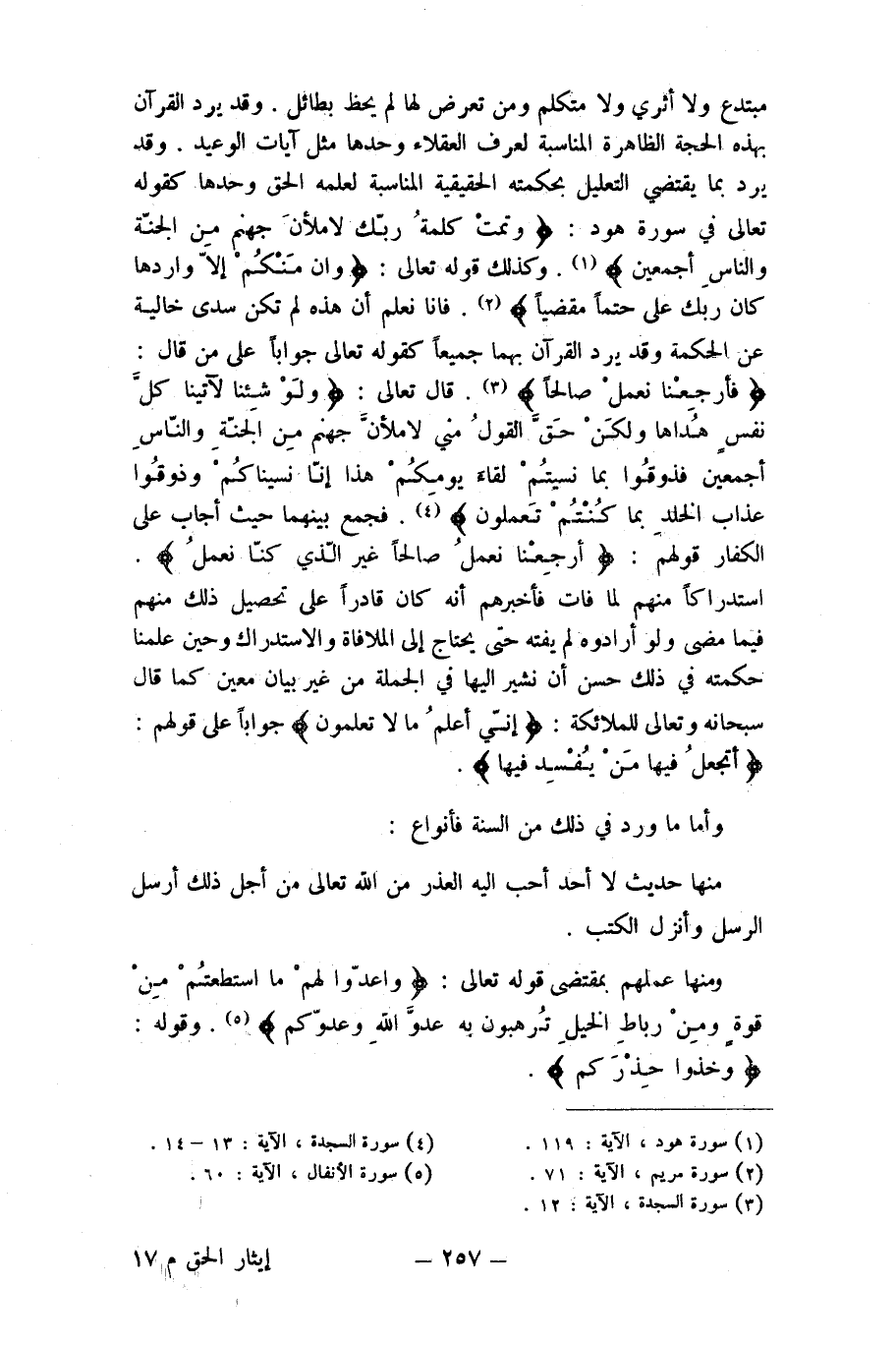 مُبْتَدع وَلَا أثري وَلَا مُتَكَلم وَمن تعرض لَهَا لم يحظ بطائل وَقد يرد الْقُرْآن بِهَذِهِ الْحجَّة الظَّاهِرَة الْمُنَاسبَة لعرف الْعُقَلَاء وَحدهَا مثل آيَات الْوَعيد وَقد يرد بِمَا يَقْتَضِي التَّعْلِيل بِحِكْمَتِهِ الْحَقِيقِيَّة الْمُنَاسبَة لعلمه الْحق وَحدهَا كَقَوْلِه تَعَالَى فِي سُورَة هود {وتمت كلمة رَبك لأملأن جَهَنَّم من الْجنَّة وَالنَّاس أَجْمَعِينَ} وَكَذَلِكَ قَوْله تَعَالَى {وَإِن مِنْكُم إِلَّا واردها كَانَ على رَبك حتما مقضيا} فانا نعلم أَن هَذِه لم تكن سدى خَالِيَة عَن الْحِكْمَة وَقد يرد الْقُرْآن بهما جَمِيعًا كَقَوْلِه تَعَالَى جَوَابا على من قَالَ {فارجعنا نعمل صَالحا} قَالَ تَعَالَى {وَلَو شِئْنَا لآتينا كل نفس هداها وَلَكِن حق القَوْل مني لأملأن جَهَنَّم من الْجنَّة وَالنَّاس أَجْمَعِينَ فَذُوقُوا بِمَا نسيتم لِقَاء يومكم هَذَا إِنَّا نسيناكم وذوقوا عَذَاب الْخلد بِمَا كُنْتُم تَعْمَلُونَ} فَجمع بَينهمَا حَيْثُ أجَاب على الْكفَّار قَوْلهم {أخرجنَا نعمل صَالحا غير الَّذِي كُنَّا نعمل} استدراكا مِنْهُم لما فَاتَ فَأخْبرهُم أَنه كَانَ قَادِرًا على تَحْصِيل ذَلِك مِنْهُم فِيمَا مضى وَلَو أرادوه لم يفته حَتَّى يحْتَاج إِلَى الملافاة والاستدراك وَحين علمنَا حكمته فِي ذَلِك حسن أَن نشِير اليها فِي الْجُمْلَة من غير بَيَان معِين كَمَا قَالَ سُبْحَانَهُ وَتَعَالَى للْمَلَائكَة {إِنِّي أعلم مَا لَا تعلمُونَ} جَوَابا على قَوْلهم {أَتجْعَلُ فِيهَا من يفْسد فِيهَا}
