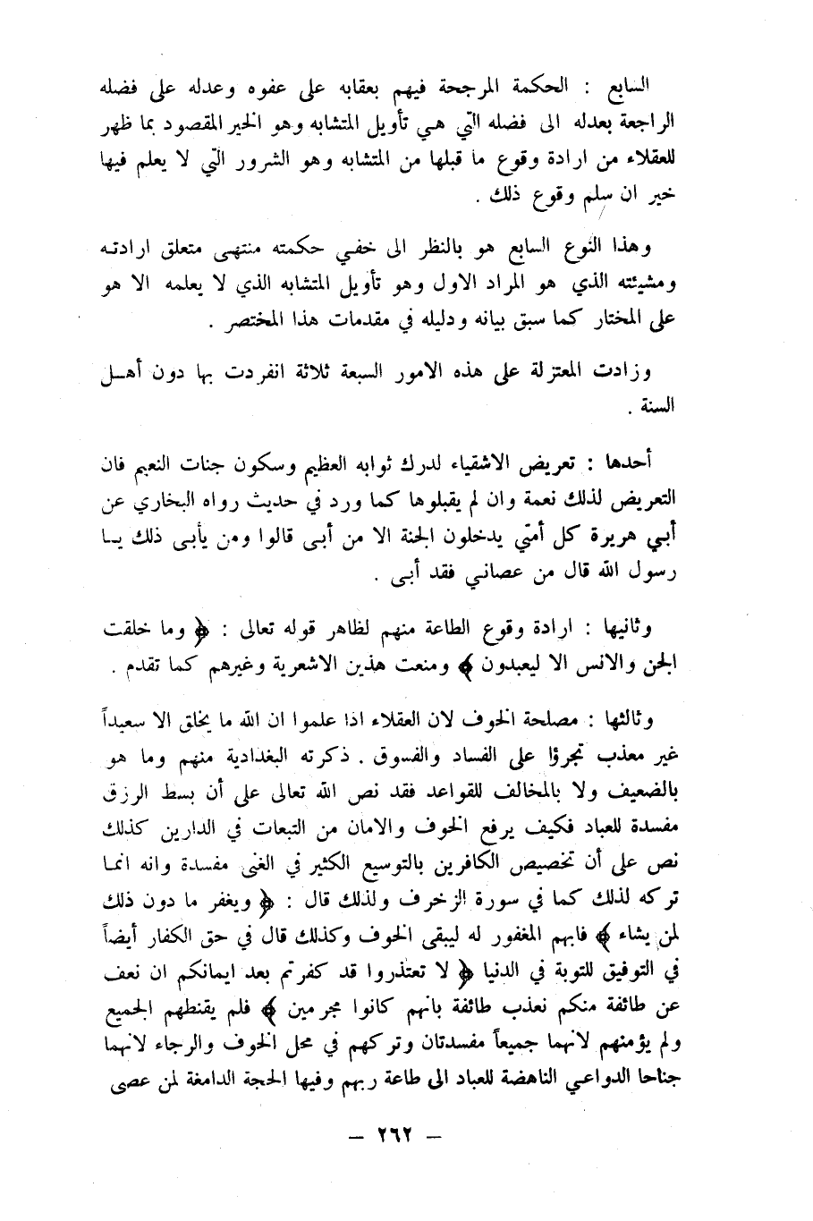 السَّابِع الْحِكْمَة المرجحة فيهم بعقابه على عَفوه وعدله على فَضله الراجعة بعدله الى فَضله الَّتِي هِيَ تَأْوِيل المشابه وَهُوَ الْخَيْر الْمَقْصُود بِمَا ظهر للعقلاء من ارادة وُقُوع مَا قبلهَا من الْمُتَشَابه وَهُوَ الشرور الَّتِي لَا يعلم فِيهَا خير ان سلم وُقُوع ذَلِك