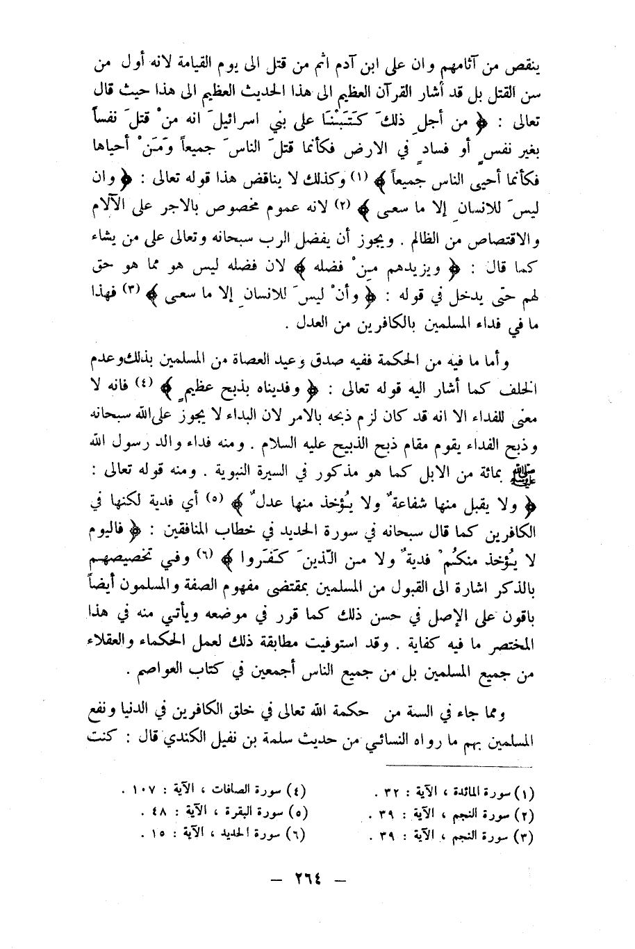 ينقص من آثامهم وان على ابْن آدم اثم من قتل الى يَوْم الْقِيَامَة لانه أول من سنّ الْقَتْل بل قد أَشَارَ الْقُرْآن الْعَظِيم الى هَذَا الحَدِيث الْعَظِيم الى هَذَا حَيْثُ قَالَ تَعَالَى {من أجل ذَلِك كتبنَا على بني إِسْرَائِيل أَنه من قتل نفسا بِغَيْر نفس أَو فَسَاد فِي الأَرْض فَكَأَنَّمَا قتل النَّاس جَمِيعًا وَمن أَحْيَاهَا فَكَأَنَّمَا أَحْيَا النَّاس جَمِيعًا} وَكَذَلِكَ لَا يُنَاقض هَذَا قَوْله تَعَالَى {وَأَن لَيْسَ للْإنْسَان إِلَّا مَا سعى} لانه عُمُوم مَخْصُوص بالاجر على الآلام والاقتصاص من الظَّالِم وَيجوز أَن يفضل الرب سُبْحَانَهُ وَتَعَالَى على من يَشَاء كَمَا قَالَ {ويزيدهم من فَضله} لَان فَضله لَيْسَ هُوَ مِمَّا هُوَ حق لَهُم حَتَّى يدْخل فِي قَوْله {وَأَن لَيْسَ للْإنْسَان إِلَّا مَا سعى} فَهَذَا مَا فِي فدَاء الْمُسلمين بالكافرين من الْعدْل